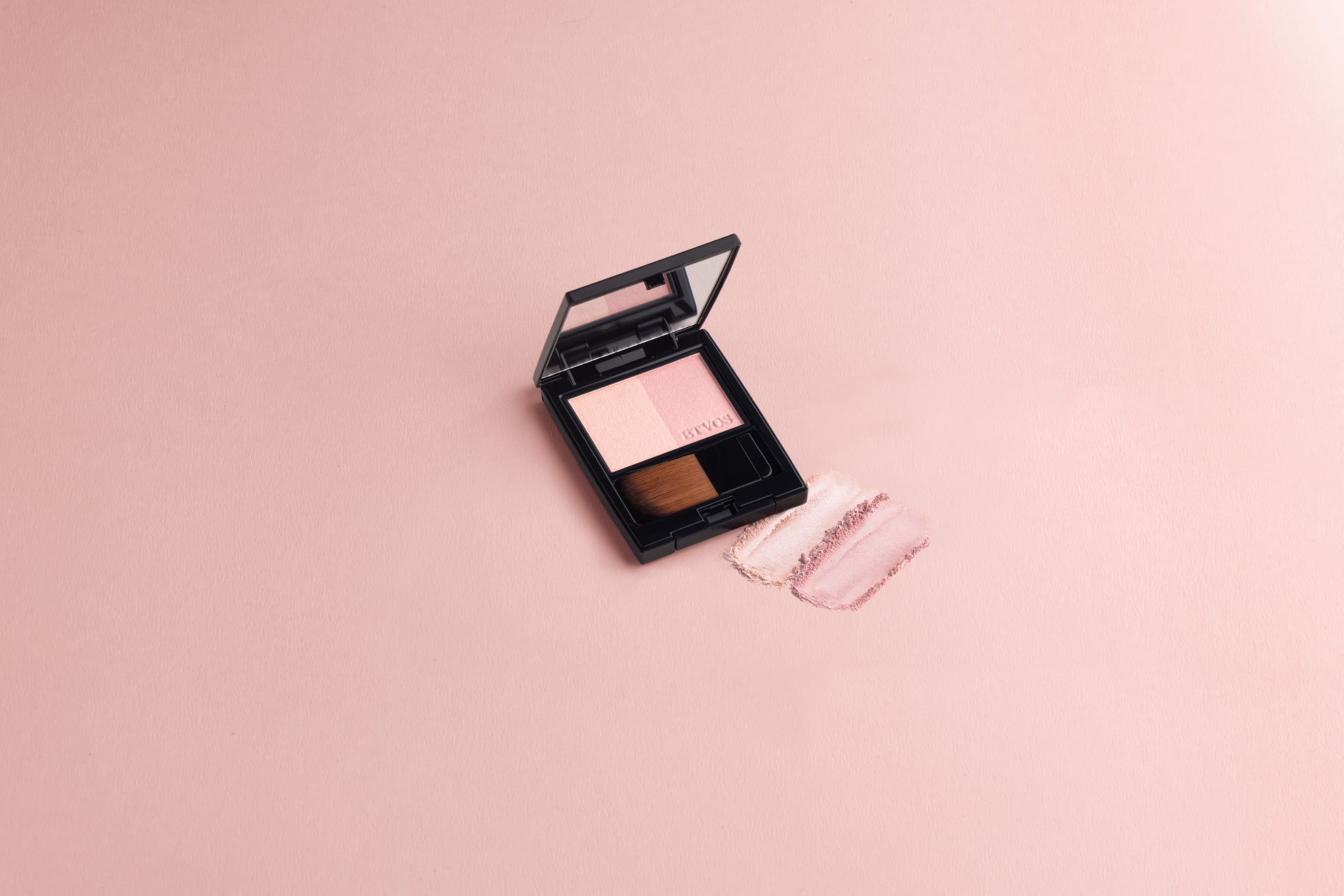 右側:チークとして。頬にほんのり血色感を添えるミュートピンクカラー。