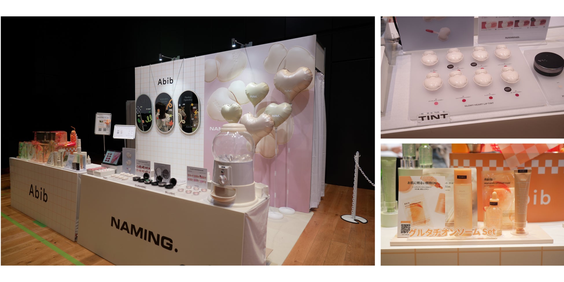 敏感肌向けスキンケアで人気のAbibはシートマスクやアイテムのテクスチャー体験コーナーを、NAMING.は自分らしいカラーを見つける楽しさを提案するブースを展開。SNS投稿特典もあり、幅広い世代が楽しんでいました。