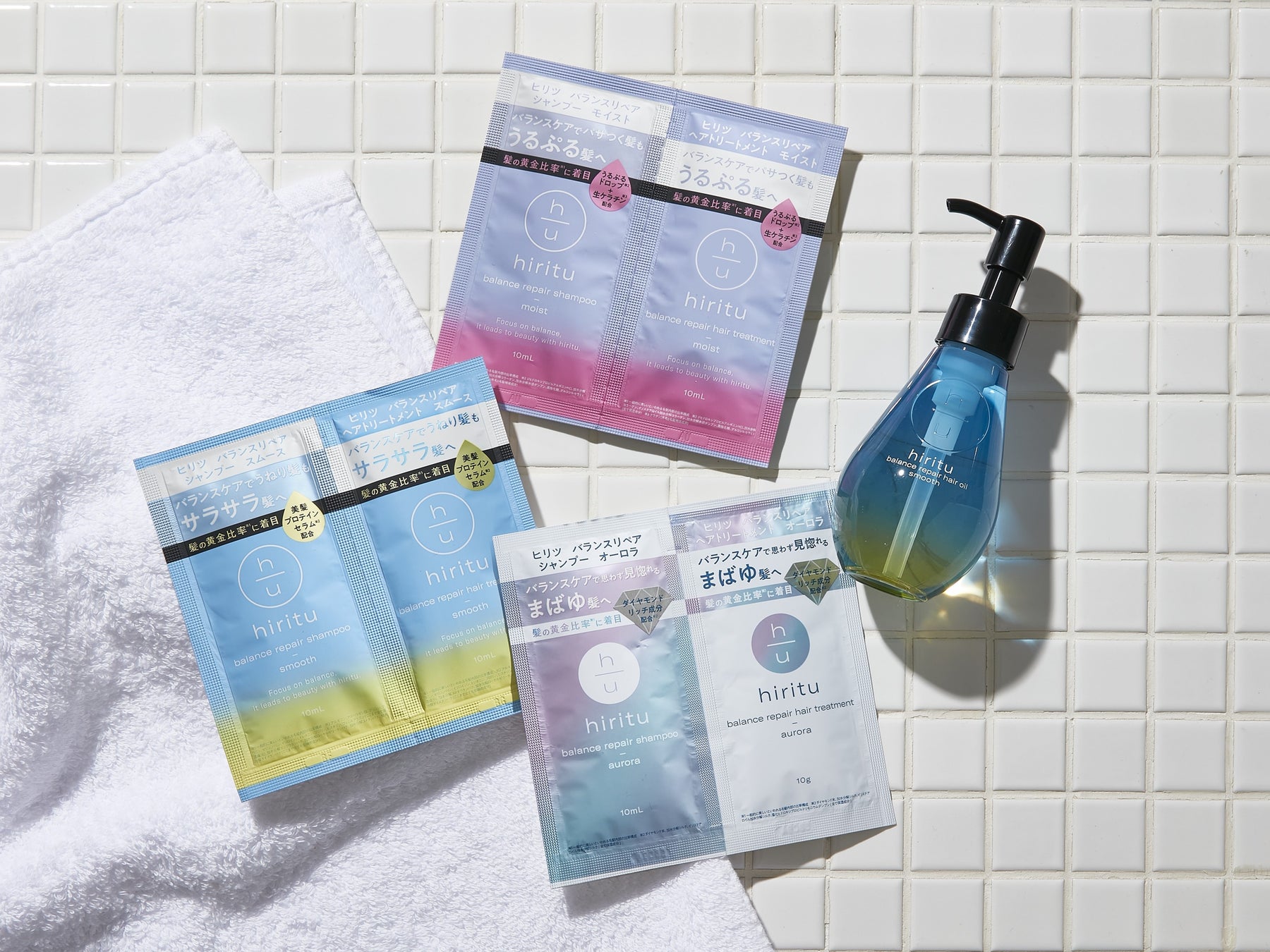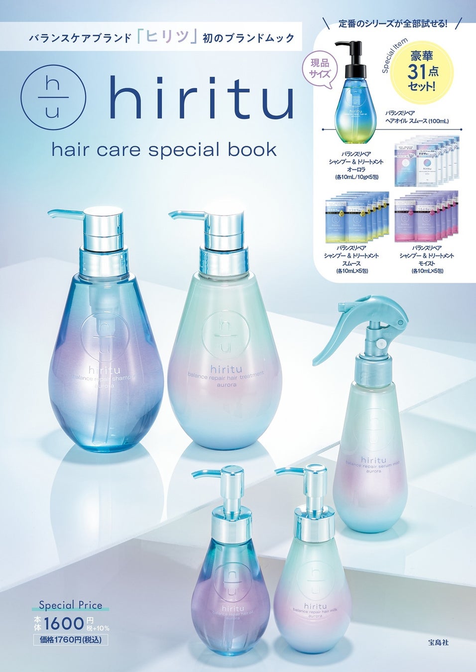 「私がきらめくバランスケア」と題して、人気モデル2名による日頃のバランスケアに着目した特集や、人気美容師によるhiritu商品のワンステップアドバイス、“香水シャンプー”といわれる香りのヒミツなど、hirituの魅力が詰まった1冊となっています。また、hirituのヘアオイル現品とシャンプー&トリートメントが合計15回分お試しできるスペシャルセット付きです。hirituが展開している3つのシリーズをすべてお試しいただけるお得なセットとなっています。