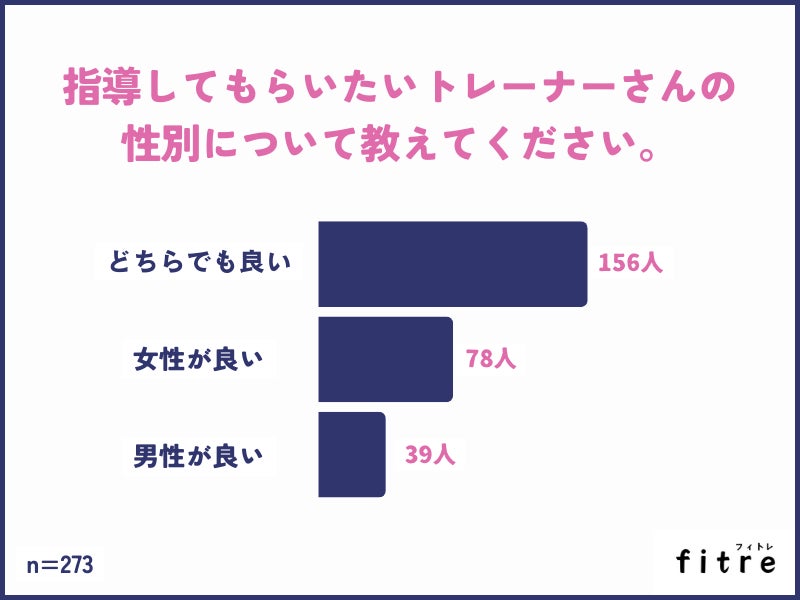 一方で、「女性が良い」という回答が78人(約29%)、「男性が良い」が39人(約14%)と続き、女性トレーナーへの需要が男性の2倍程度あることが明らかになりました。