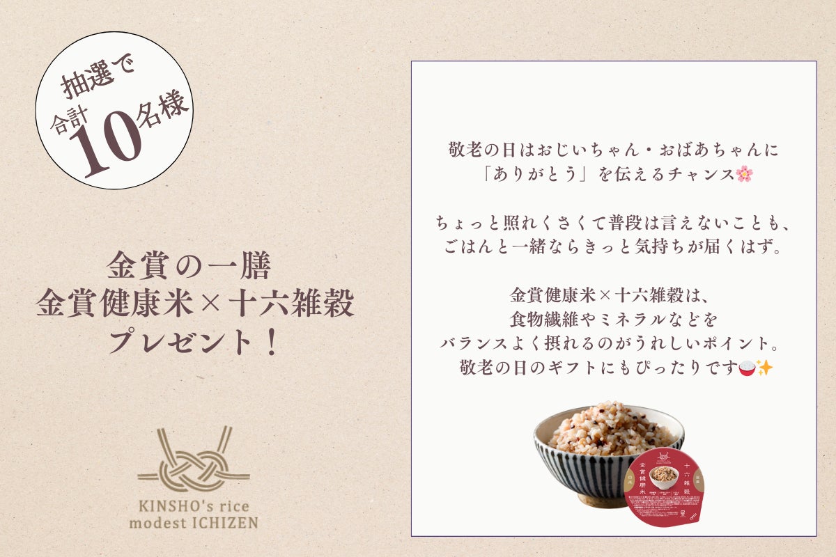 今回のキャンペーンでは、抽選で10名の方に、『金賞の一膳』シリーズの人気商品『金賞健康米×十六雑穀』 5パックをプレゼントいたします。ぜひ、キャンペーンにご参加ください。