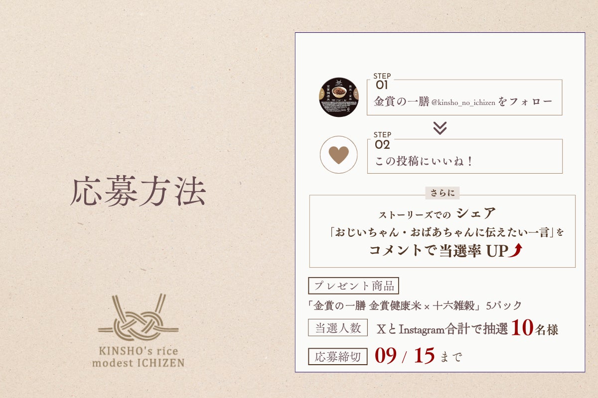①金賞の一膳公式Xアカウントをフォロー ②敬老の日プレゼントキャンペーン投稿をリポスト ③同投稿に「おじいちゃん・おばあちゃんに伝えたい一言」をコメントで当選確率アップ |
