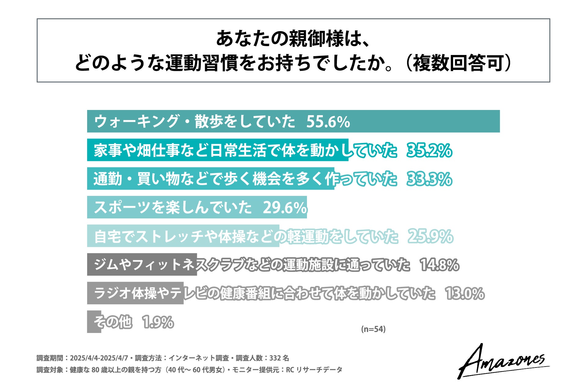 調査の最後、親御さんが健康的な生活を長く続けられている理由として、最も大きいと思うものを「運動習慣を身につけていた」ことと回答された方に「親御さんは、どのような運動習慣を持っていたか」を尋ねる設問への回答で最も多かったのは、1位が「ウォーキング・散歩をしていた」で55.6%、次いで2位が「家事や畑仕事など日常生活で体を動かしていた」で35.2%、3位が「通勤・買い物などで歩く機会を多く作っていた」で33.3%という結果になりました。また4位以降も、回答率20%を超える回答が複数並ぶ形となり、80歳以上で健康な人は多岐に渡る運動習慣を持っていたことが、この結果からわかりました。