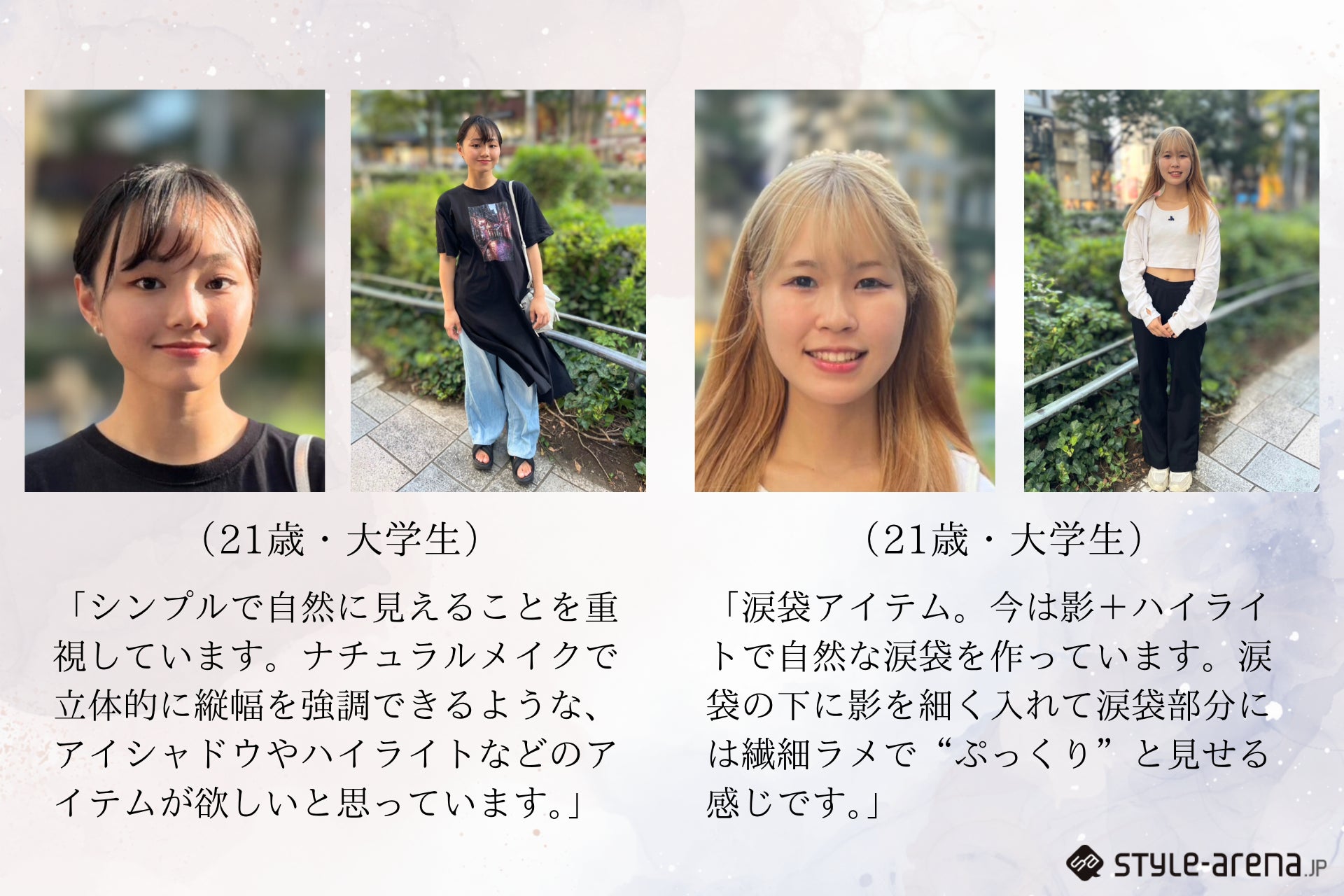 「もともと涙袋がなくて悩みでもありますが、涙袋があるように見せるメイクテクニックが、SNSにたくさん情報が流れているので『私もこうなれるかも?』と思った。長めのまつげ&涙袋の存在感があることで、ナチュラルだけど盛れるし、常にTikTokなどで情報収集しています。」(右の協力者の深掘りコメント:21歳・大学生)