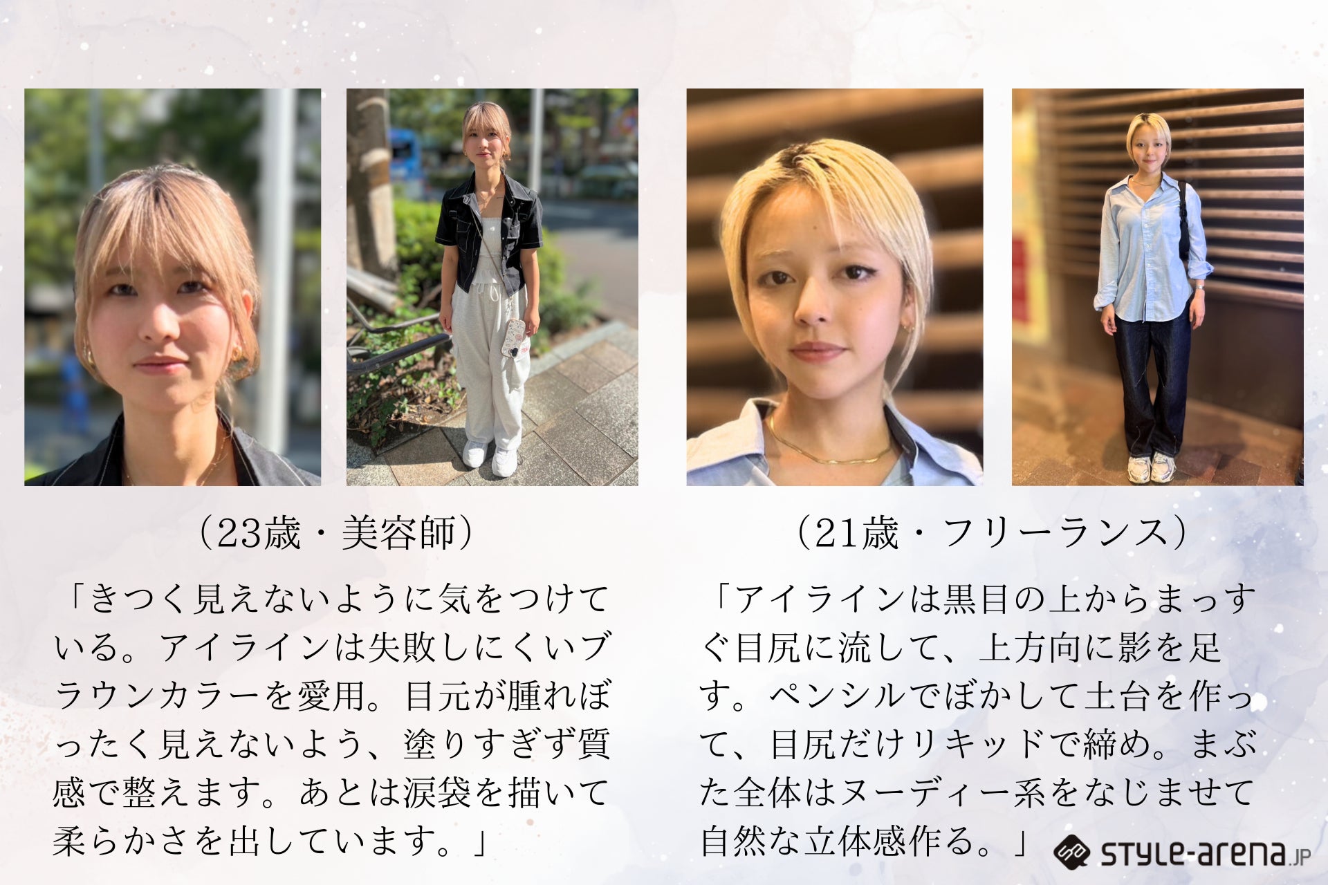 「気分によってメイクを調整したいこともありサロンには行ってません。アイメイクを変えるきっかけはYouTuberなどですが、基本は人のメイクを真似することはあまりなく、自分に合うスタイルを重視して探求している。試したいアイメイクが髪色やファッションでも変わります。」(右の協力者の深掘りコメント:21歳・会社員)