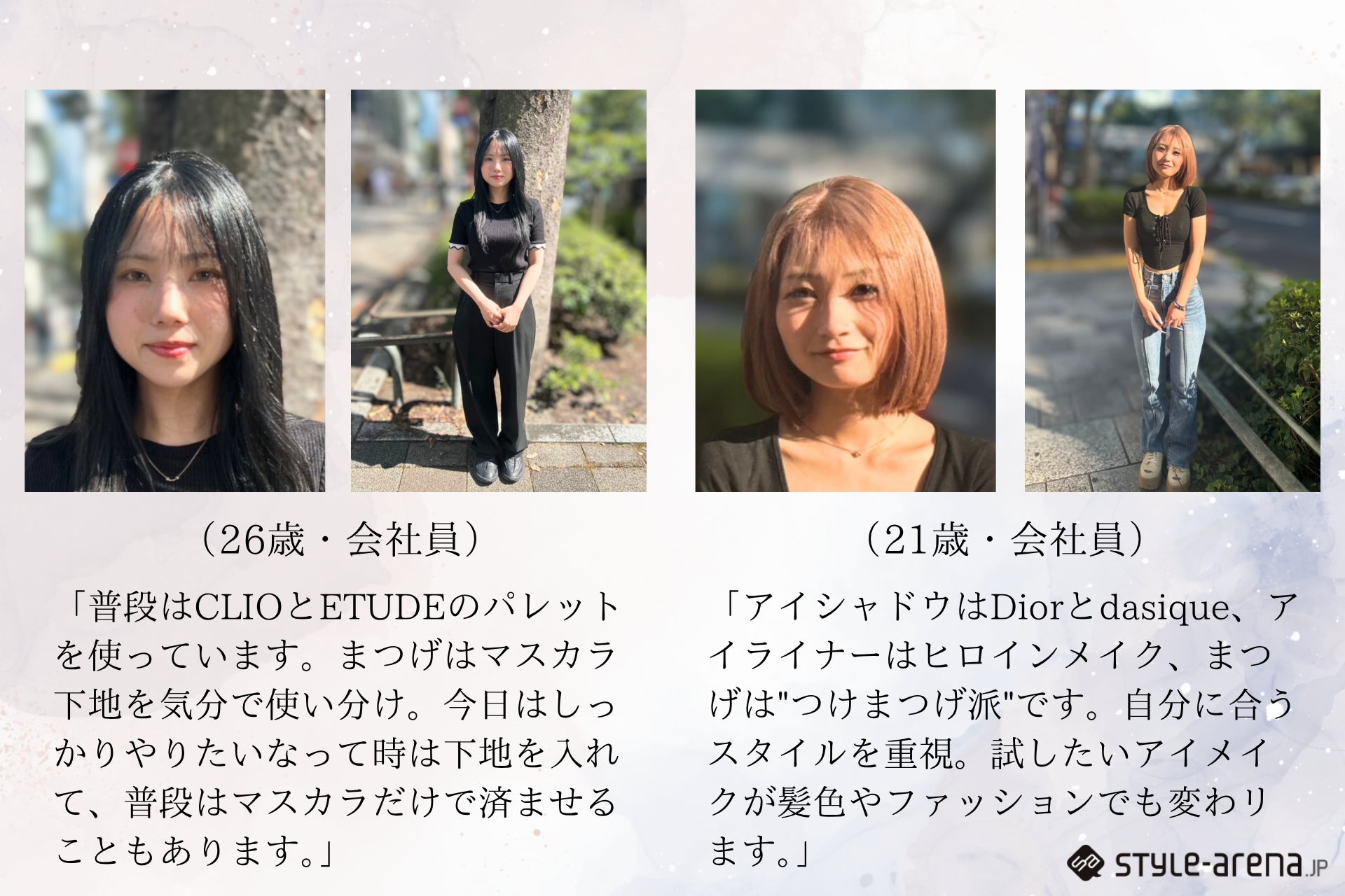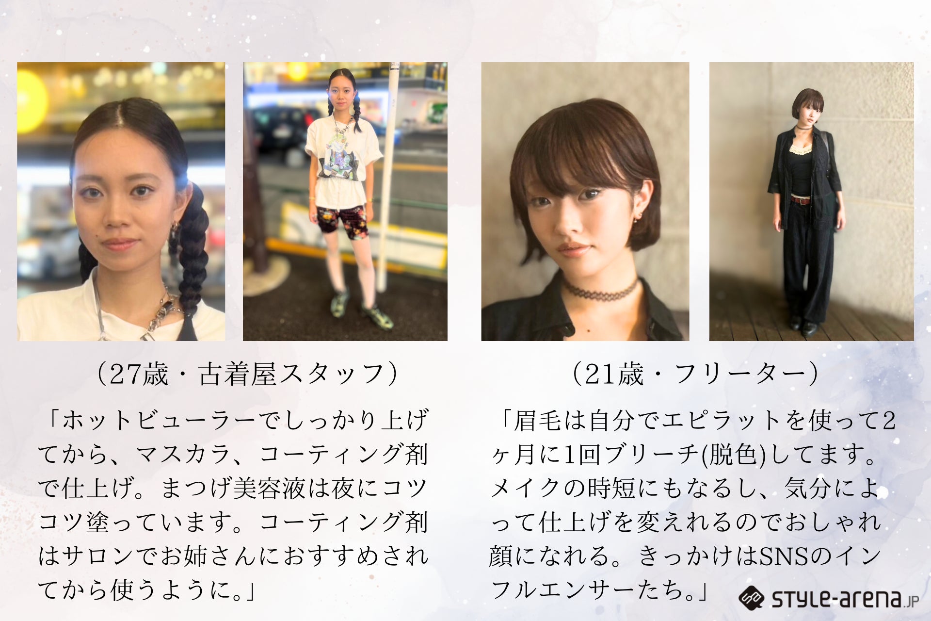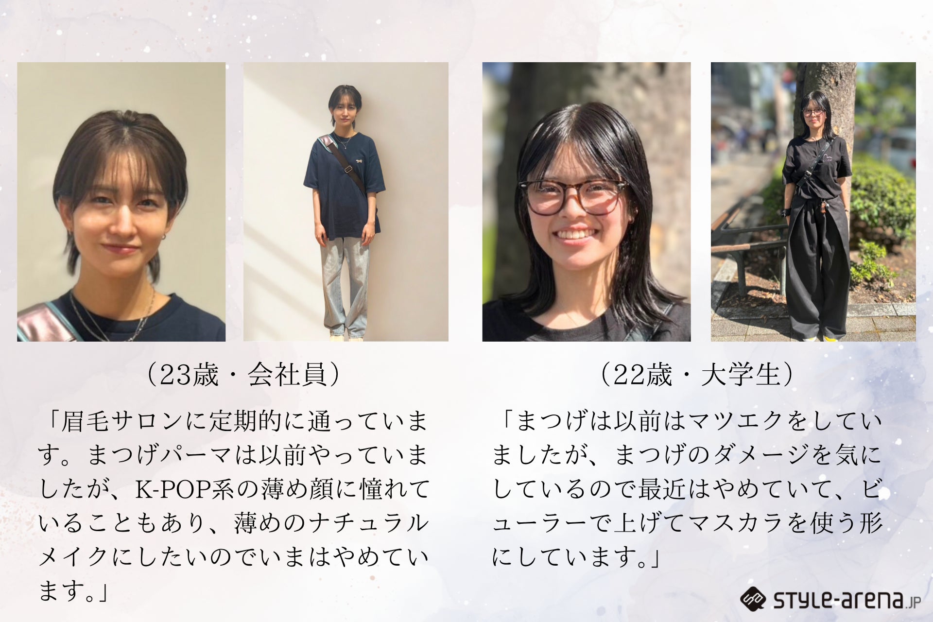 「自まつげを強化していきたい。美容液は決まったブランドではなく、いろいろ試しています。今、使っているものは伸びを実感できますが、もっと太さや強さが欲しいと思っていて、新たなアイテムを探しています。」(右の協力者の深掘りコメント:22歳・大学生)