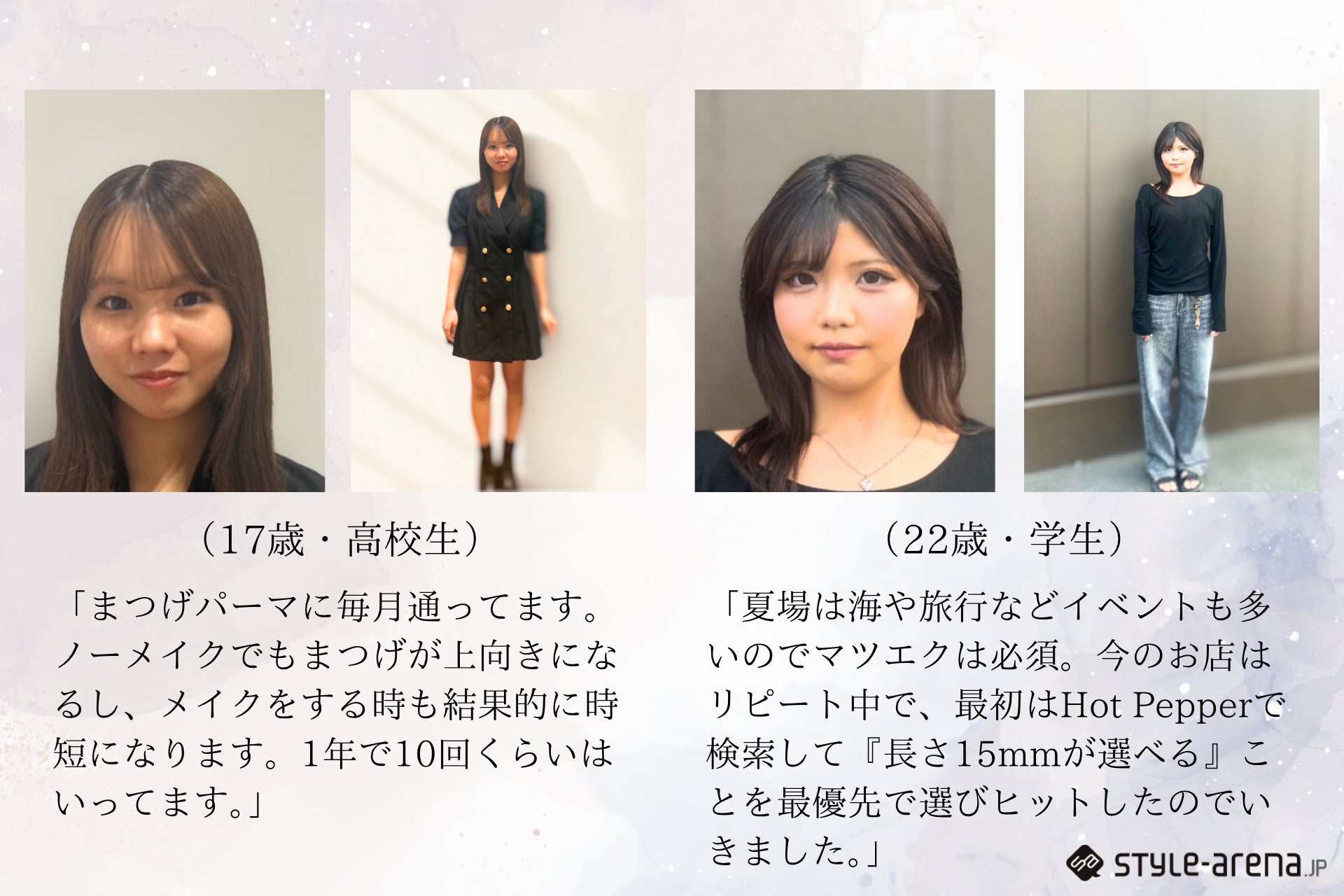 マツエクは「日常的に”メイクの一環”としてする人」と「イベントや盛りたい時期に“束感・ボリューム・長さ”を確実に足す手段としてやる人」との二極化。いずれも施術をするときは、長さ・太さ・デザイン(J/C/D、目尻強調など)の希望するスペックで探し、サロンを選択しています。たとえば「マツエク15mm対応のメニュー」があって初めて、サロン候補に入るといった声もあり、“条件一致→初回→当たりなら指名”の動線が今の消費者行動の定番パターンのようです。