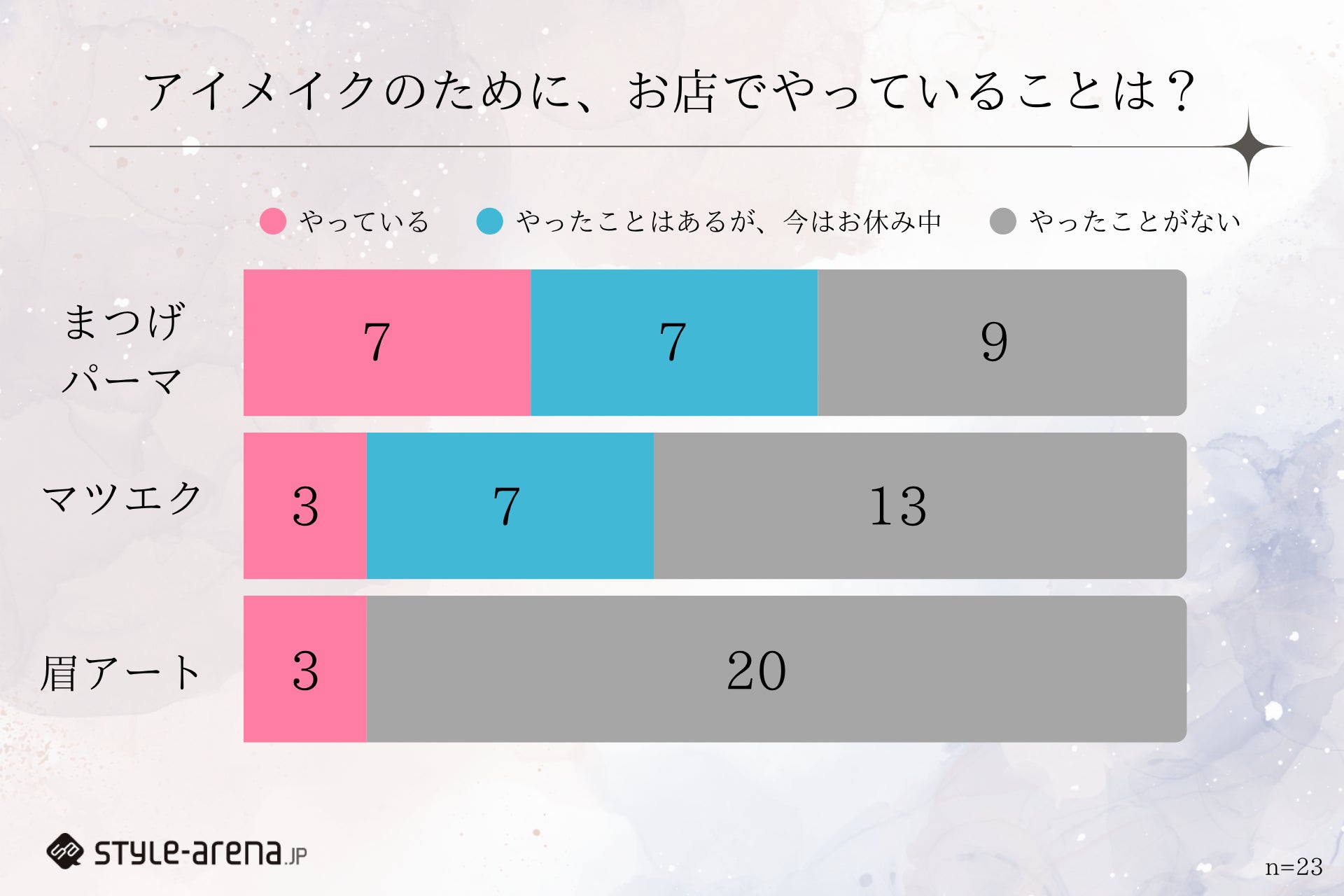続いて「アイメイクのために、お店でやっていることは?」と質問したところ、サロン利用は大きく「まつげ=可変(自身の状況によって調整)」「眉=固定(自分の理想を常にキープ)」という明確な結果にわかれました。