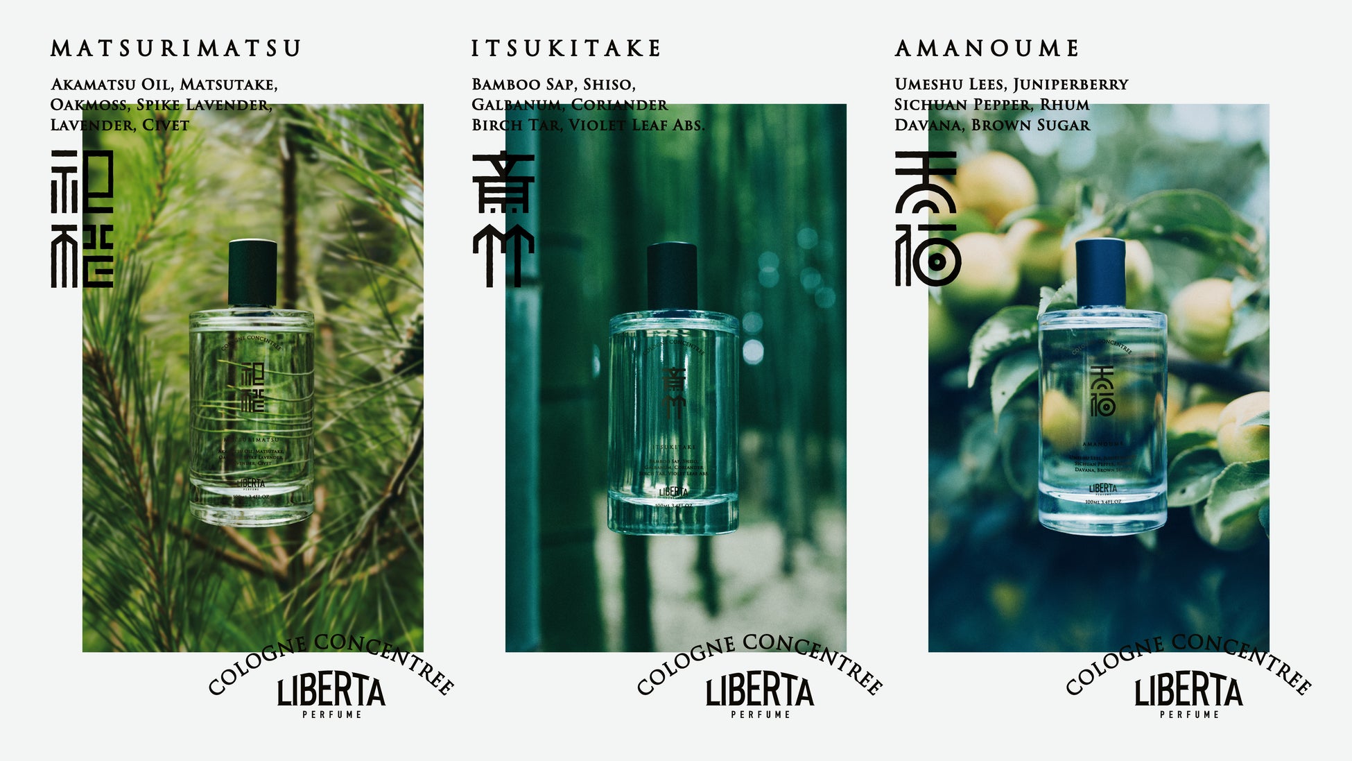 同コレクションから3年ぶりの新作となる本作は、日本のハレの象徴「松竹梅」を主題に、それぞれ「赤松の精油」「竹水」「梅酒」という新しい香料素材を用いて調香。また、コロンコンサントレという独自の濃度(賦香率)が採用され、素材のユニークさを活かしながら、生活に馴染むライトな使い心地を実現している。