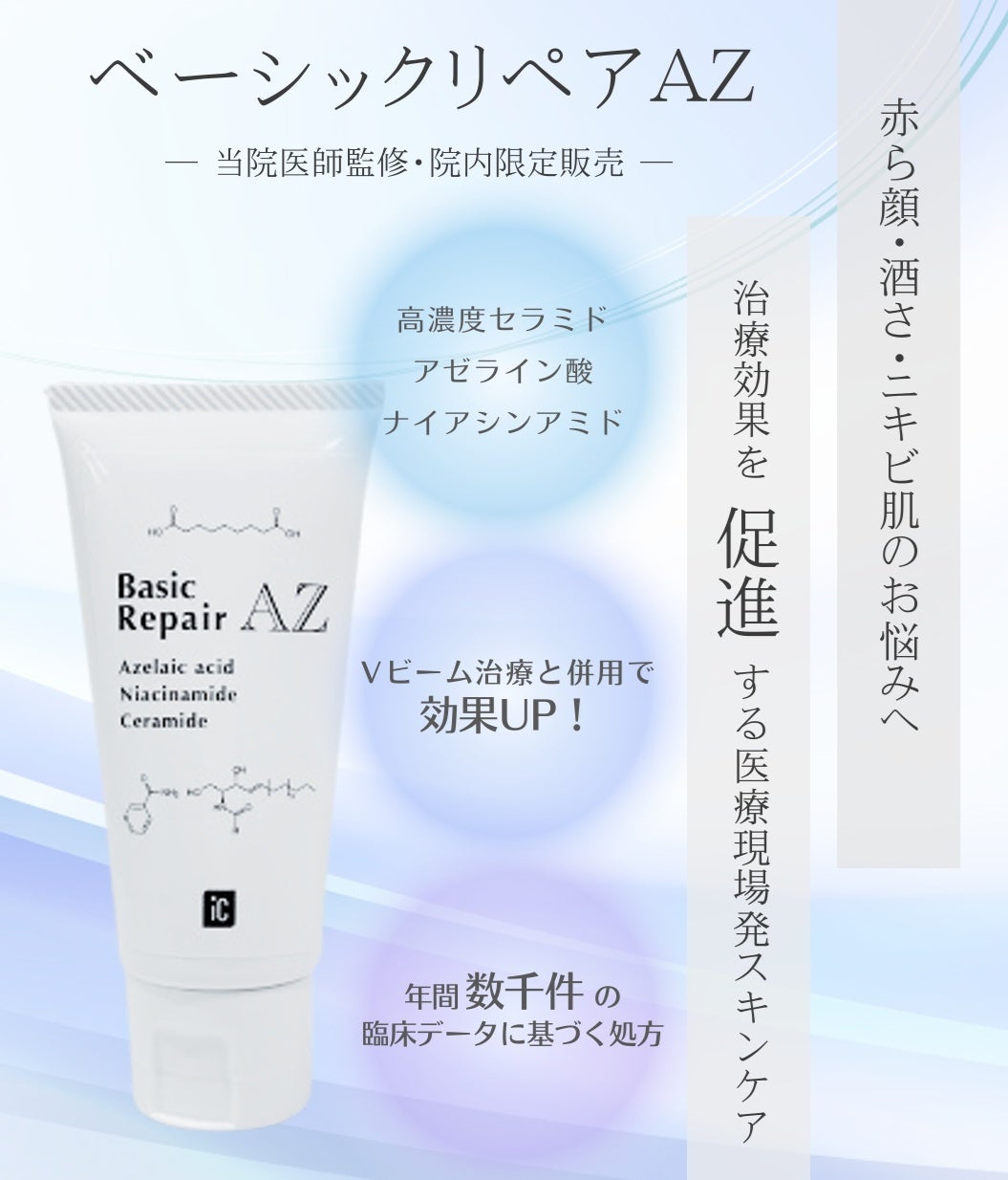 アイシークリニックは皮膚科・美容皮膚科領域において、エビデンスに基づいた治療と患者様一人ひとりに寄り添う診療を大切にしています。「ベーシックリペアAZ」は、治療後の肌を守り、美しい素肌づくりをサポートするために誕生した医療現場発のスキンケア製品です。