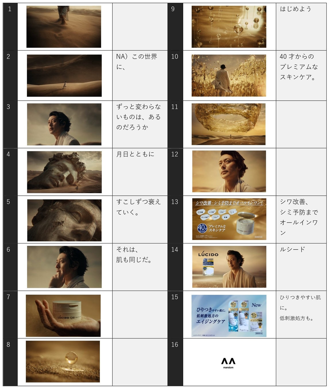 冒頭では、乾ききった砂の世界を歩くオダギリさんの眼前に、「巨像の顔」が現れます。風化した巨像と自らの肌を重ね合わせ、経年変化に思いを馳せるオダギリさん。そこで、「ルシード」を差し出すと、あたりの景色が変わりはじめ、砂の下からみずみずしい液体が湧き出してきます。空に渦巻く美しい液体の表現と黄金色に輝く世界は、1品で6役のプレミアムな商品「ルシード 薬用パーフェクトスキンクリームEX」をイメージし、美術と最先端のCGを駆使して作り上げられています。ご本人も映画監督として活躍するオダギリさんが、出演者として衣装や演出にいたるまで監督と話し合い、プレミアムな商品を表現する美しい世界観が生まれました。