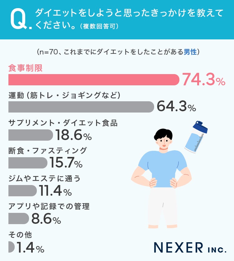 女性に比べ、健康診断や医師の指摘がダイエットのきっかけになった方は約2倍で、男性の方が健康診断等での指摘が多いことが分かりますね。