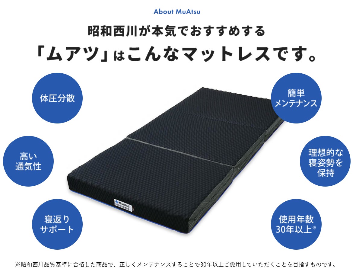 快適な睡眠空間を追求して開発された、独自の凹凸構造と3層ウレタンを備えた高機能マットレスMuAtsu(ムアツ)。上層の凹凸構造が身体をやさしく支え、中層で体圧をバランスよく分散、下層が全体をしっかりと受け止めることで、理想的な寝姿勢をキープします。さらに、高通気ウレタンを採用することで、蒸れにくく、快適な睡眠環境をサポートします。
