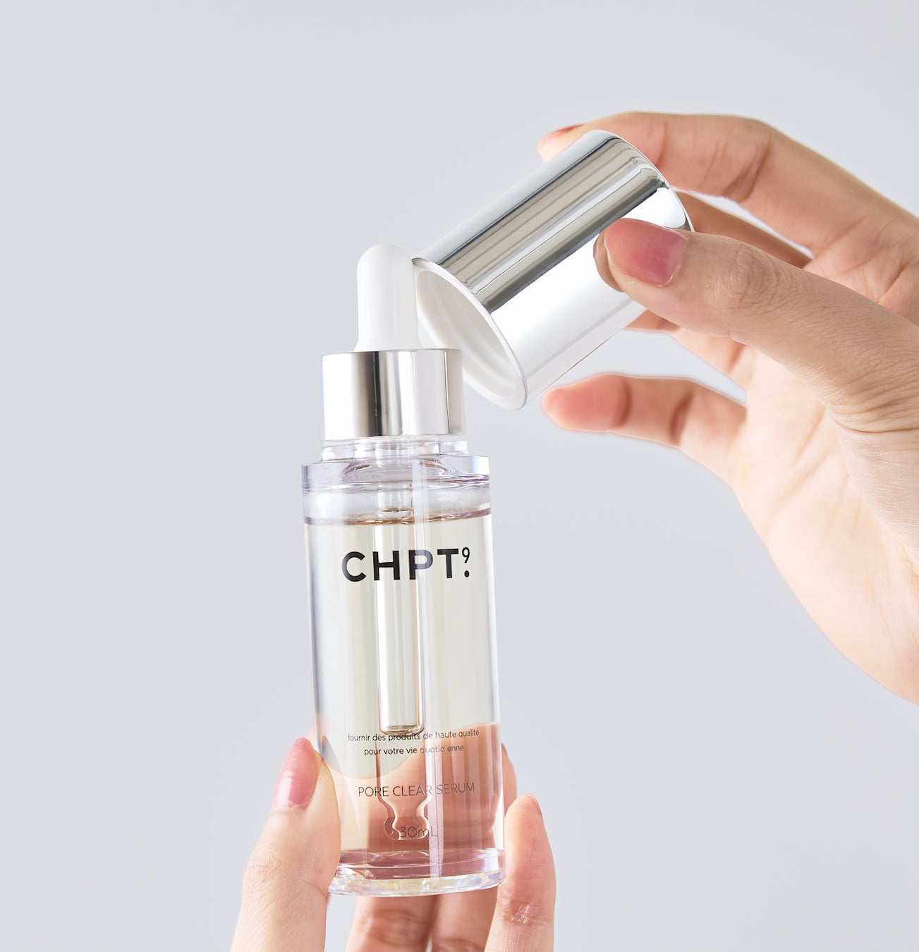 CHPT.⁹(チャプトナイン)『ポアクリアセラム』は、頑固な角栓汚れを構成する脂質や、根深くこびりついてしまった黒ずみ*¹に着目し、「角栓崩壊*²処方」を採用。白いニョキニョキ角栓や、汚れ、酸化皮脂などの、肌トラブルの原因となる毛穴詰まりを、根本から一掃することを可能にしました。