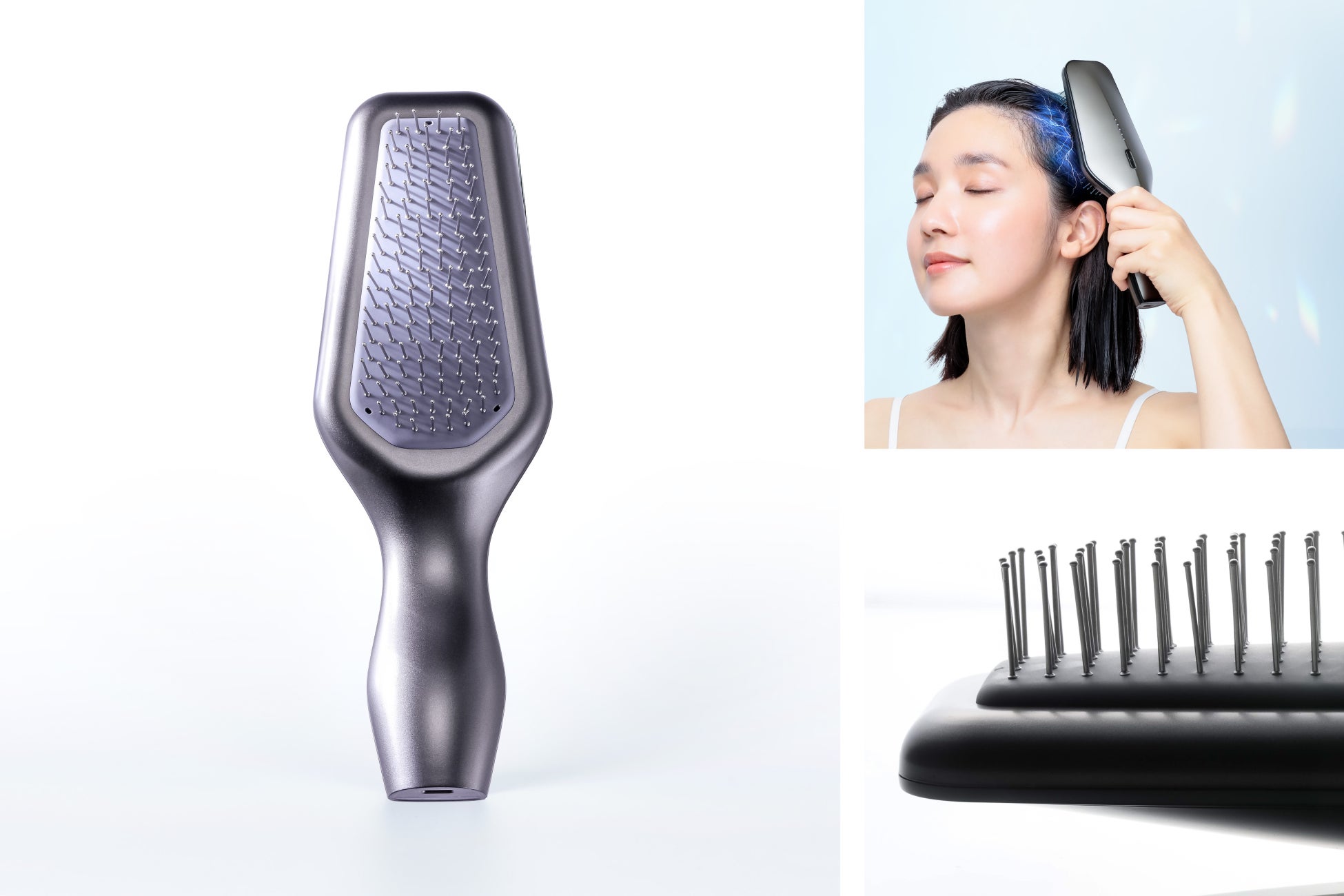頭皮に微弱な電気刺激を与えるヘアブラシ。頭皮の「立毛筋」に刺激を与えることで、髪を根元からふわっと立ち上げる。