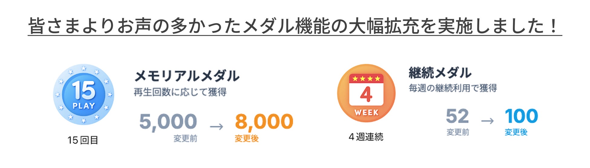 ユーザーの皆様の運動継続へのモチベーション向上を目的に、特定条件達成で獲得できるメダル機能の上限を引き上げます。長くサービスをご利用いただいているユーザーに、新たな目標と達成感を提供し、より楽しくトレーニングを続けられる環境をご用意いたします。