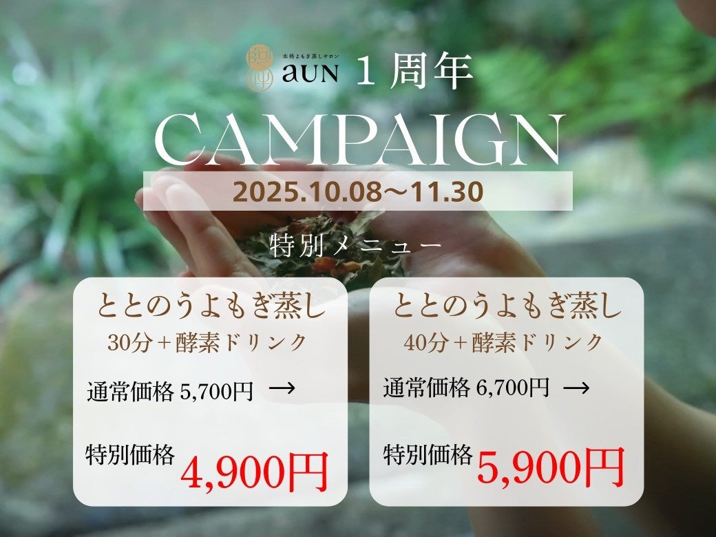 本格よもぎ蒸しサロン aUN は、2025年10月におかげさまで1周年を迎えます。これまでのご愛顧に心より感謝するとともに、この節目を機に「ゼロに戻る場所」というコンセプトをさらに進化させ、お客様一人ひとりの心身のリセットを叶えるサロン体験を進化させるべく、aUNオリジナルプログラム「ととのうよもぎ蒸し」をスタート。