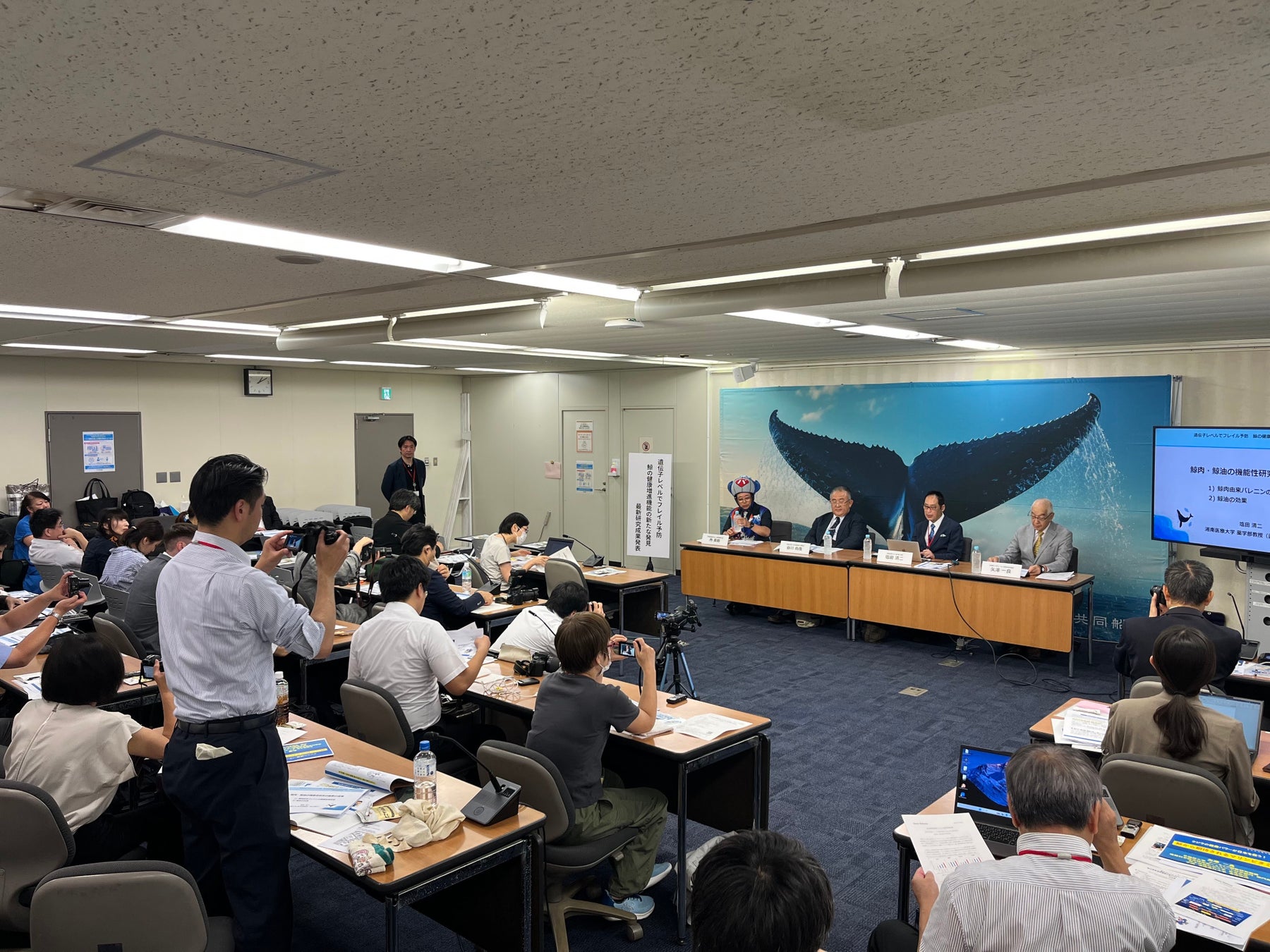 本発表会には、報道関係者多数が参加。鯨肉・鯨油が持つ健康増進効果について、湘南医療大学 薬学部の塩田清二教授、早稲田大学ナノ・ライフ創新研究機構の矢澤一良先生、共同船舶株式会社 代表取締役社長 所英樹氏、そして一般社団法人日本捕鯨協会 谷川尚哉理事長が登壇し、最新の科学的知見と今後の展望について解説しました。