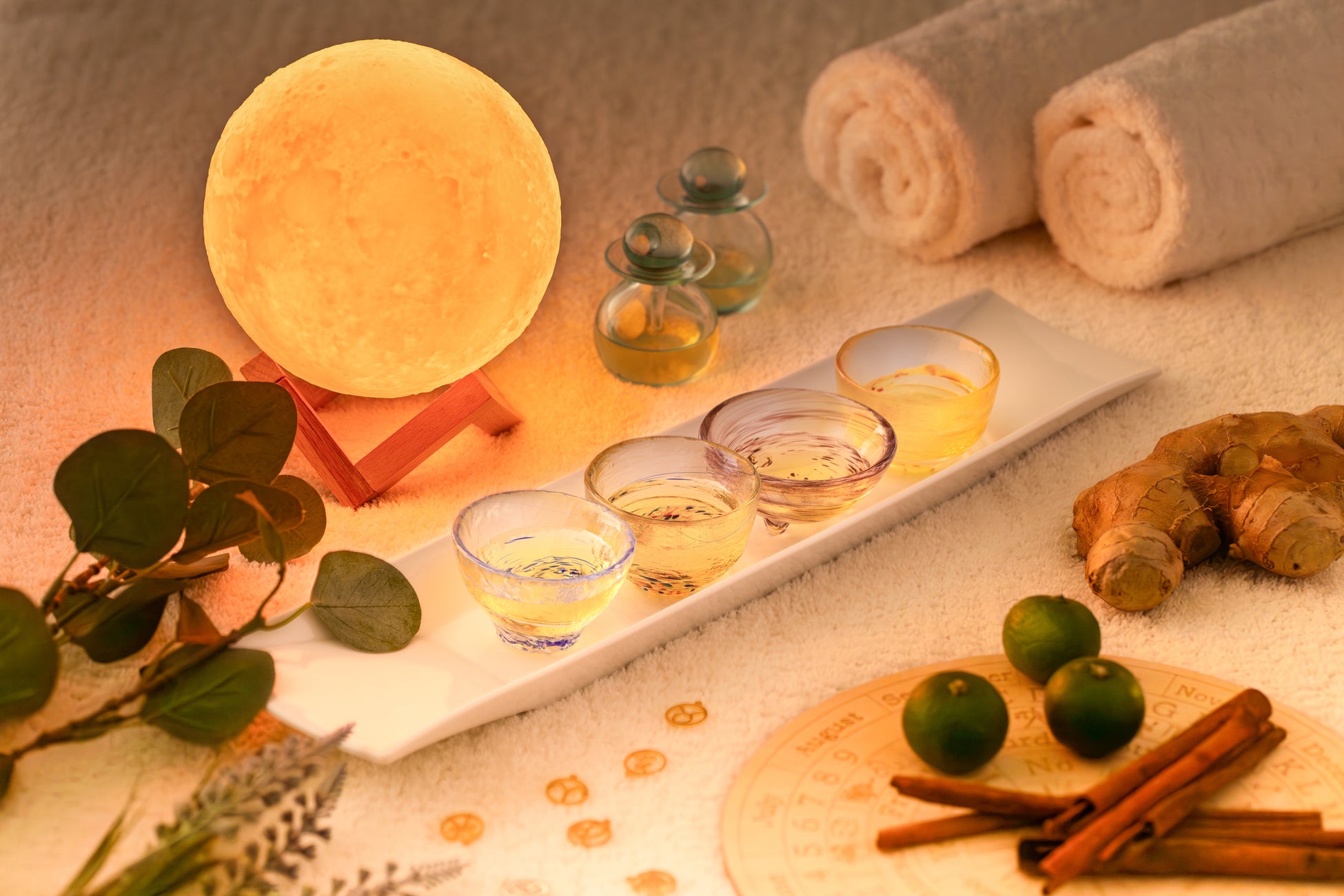 そのほか、土のエレメントには、サンダルウッドやベチバーが大地のように安心感をもたらす香り、風のエレメントには空気を浄化させるようなユーカリやベルガモットのすっきりとした香り、水のエレメントには、リラックス感のあるやわらかなラベンダーとジャスミンの香りがそろいます。ご自身の星座に合わせてお選びいただくことはもちろん、心身が求める香りをお好みでお選びいただくことも可能です。セラピストが、首や肩、背面やヘッドなどをじっくりとマッサージし、ゲストの皆さまは、ご自身の星座の香りやお好みの香りに包まれながらゆっくりと解きほぐされていく至極のひとときをお楽しみいただけます。