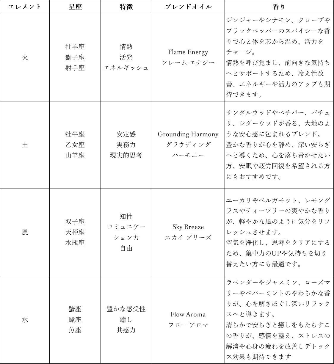 「星座のエレメンタル トリートメント」は、「火、土、風、水」4つのエレメントに分類される12星座に着目し、それぞれのエレメントの特性に合わせて熟練のセラピストが調合したオリジナルオイルをつかい、全身をじっくりとマッサージすることが特徴です。火のエレメントである牡羊座、獅子座、射手座の人は、活発で情熱がありエネルギッシュであると言われています。その火のエレメントには、ジンジャーやシナモン、クローブやブラックペッパーなどの精油をブレンドした、心も身体も温めて活力をチャージするようなスパイシーな香りのオリジナルオイルを使用いたします。情熱を呼び覚まし、前向きな気持ちへとサポートするこの香りは、冷え性の改善やエネルギーと活力のアップも期待できます。