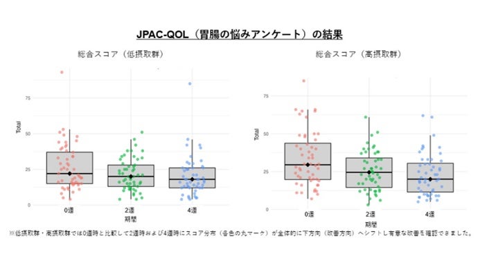 食物繊維の低摂取および高摂取グループでは2週間の摂取でJPAC-QOLスコアが有意に改善しまし