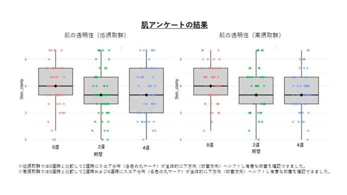 した。また、高摂取グループでは2週間・4週間の摂取にて肌の透明性が改善されたとの回答が有意に