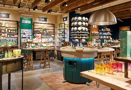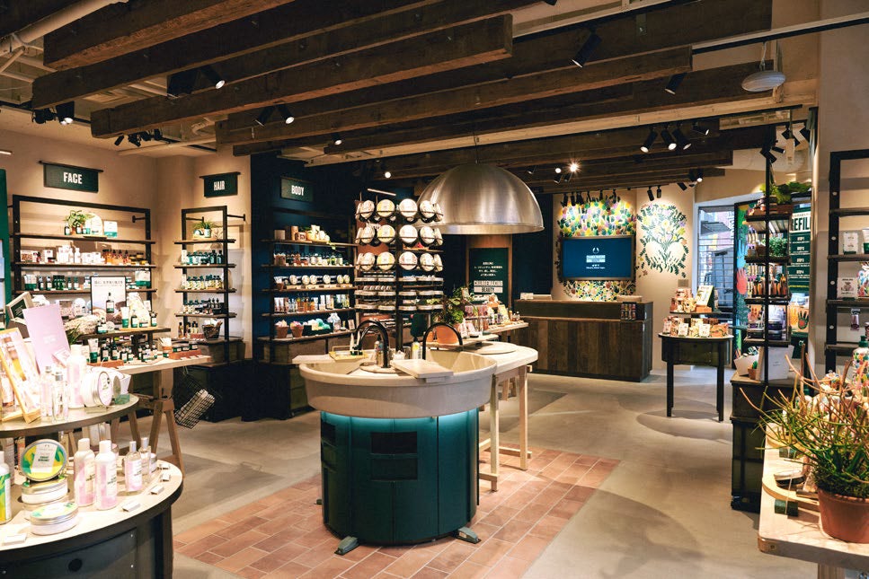 旗艦店である東京・新宿店は、引退した新幹線の車両アルミをリサイクルした再生アルミや解体された家屋の古材、再生プラスチック、堆肥化可能な容器など、ほぼ100%再生可能な素材を使用した循環型の店舗です。店内には、プラスチック削減のための詰め替えサービス「リフィルステーション」も設置しています。