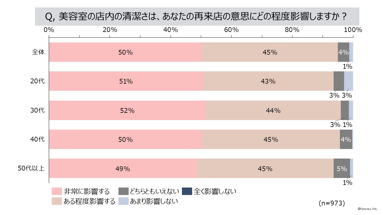お客さまの声を最先端の分析でファン増加につなげる企業、株式会社ファンくる(本社:東京都千代田区、代表取締役社長:山口敬人)は、「ファンくる」会員を対象に、定期的に消費者の意識調査を実施しています。今回は美容室の清潔さについて、再来店意思への影響や、清潔さが最も気になる箇所などを「ファンくる」会員973名(男性197名、女性776名)に調査を実施しました。