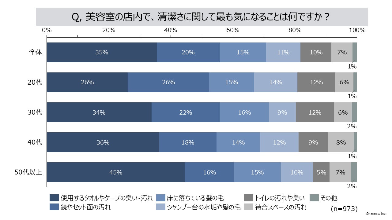 美容室店内の清潔さで最も気になるのは「使用するタオルやケープの臭い・汚れ」35%、「鏡やセット面の汚れ」20%