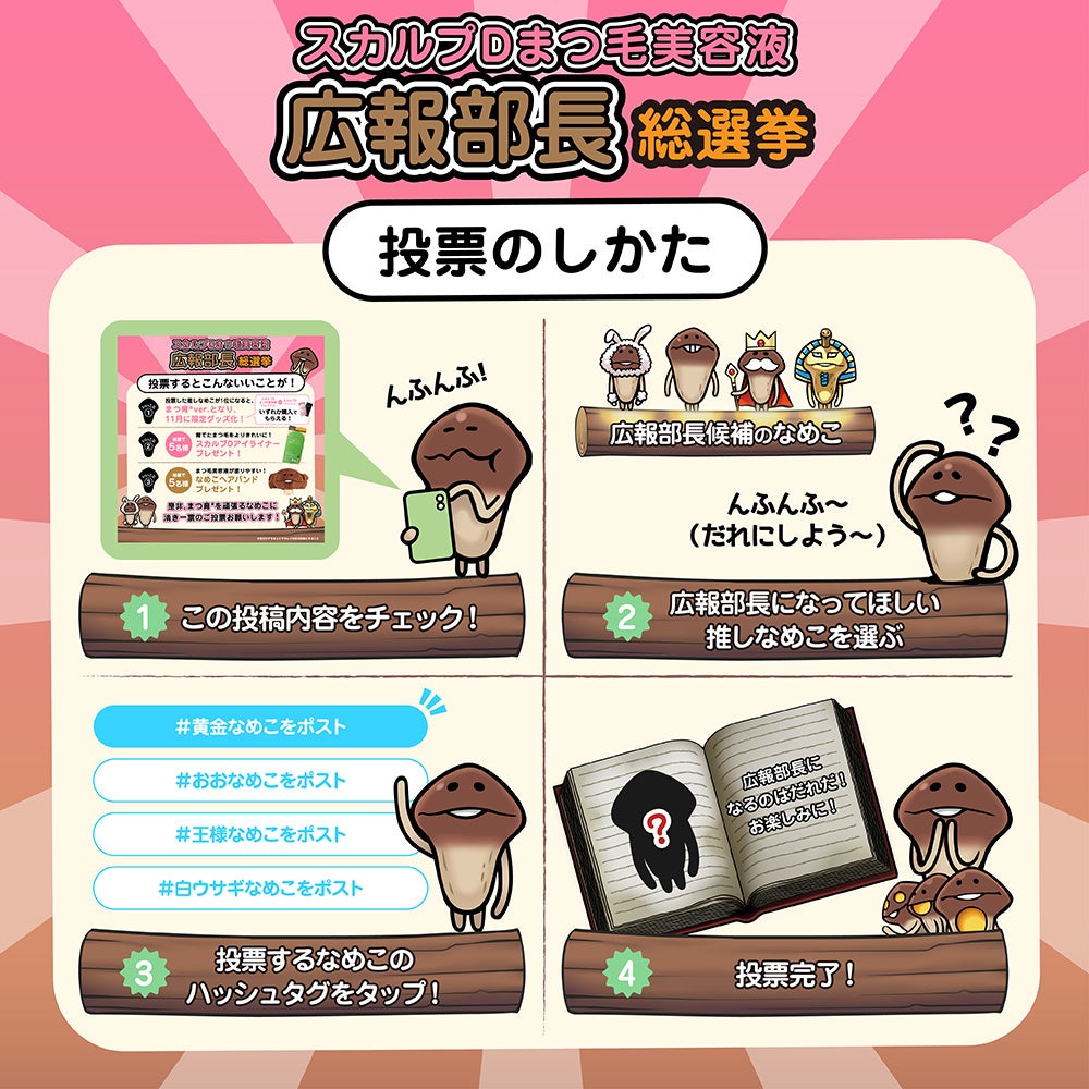 今回、「スカルプDまつ毛美容液」の広報部長として「なめこ・枯れなめこ・マサル・ラブなめこ・なめ子」の5匹が就任いたしました。そして残る広報部長の1枠の座をめぐり、新たに4匹のなめこが立候補!