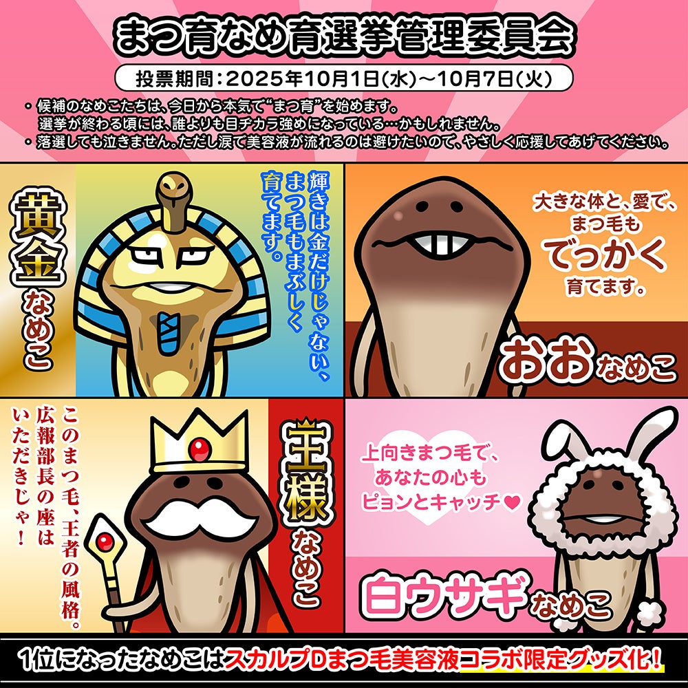 ゆるくも熱い、負けられない決戦!勝つのはどの“なめこ”!?清き1票でコラボ限定グッズが決まる「スカルプDまつ毛美容液」×「なめこ栽培キット」広報部長総選挙 開催決定!2025年10月1日(水)投票開始