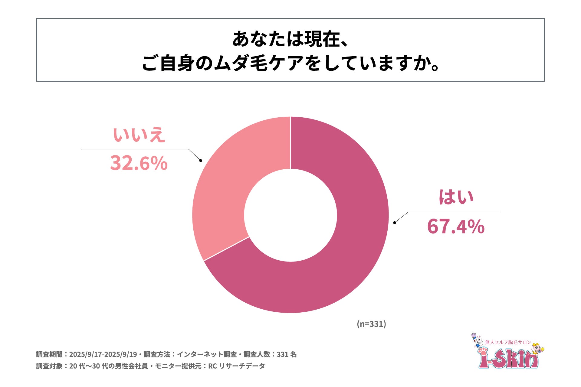 また、「現在、自身のムダ毛ケアをしているか」を尋ねる設問への回答では、「はい」が67.4%、「いいえ」が32.6%という結果になりました。この結果から、20代〜30代の男性会社員の約7割が現在、自身のムダ毛ケアをしていることが明らかになりました。