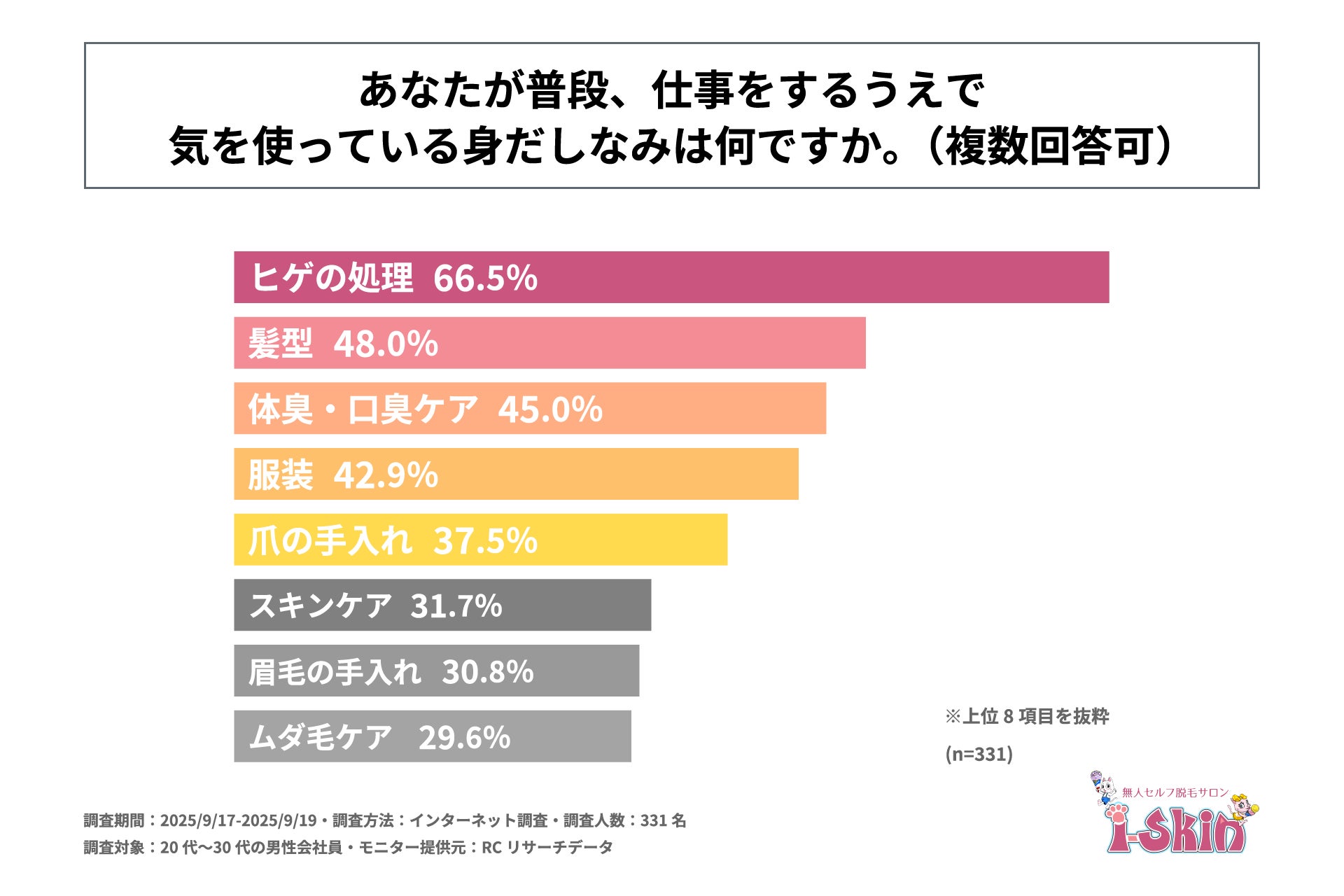 i-Skin合同会社(本社:東京都中央区、代表社員:石川 隼佑)が運営する「無人セルフ脱毛サロン i-Skin」は、20代〜30代の男性会社員を対象に「若手男性会社員の身だしなみとムダ毛ケアに関する調査」を実施しました。この調査から、20代〜30代の男性会社員が気を使っている身だしなみやムダ毛ケアへの意識などが明らかになりました。