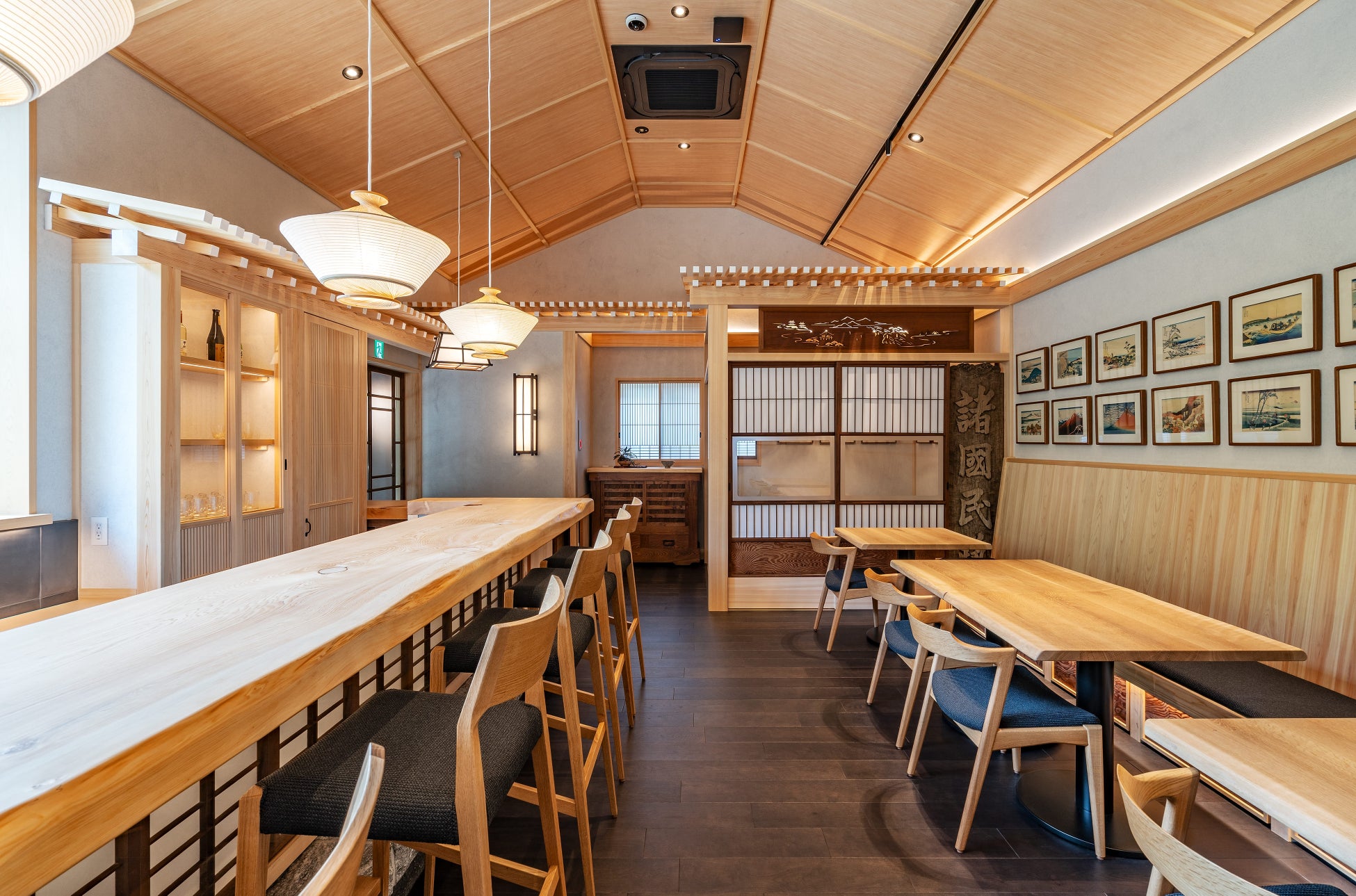 器は、駿府の工房 匠宿の職人やインストラクター達による、一点もの。店内には、葛飾北斎の富獄三十六景や駿河竹千筋細工が飾られ、東海道の歴史を感じながらお過ごしいただけます。里山の和処にて、ほっと和むひとときをお過ごしください。