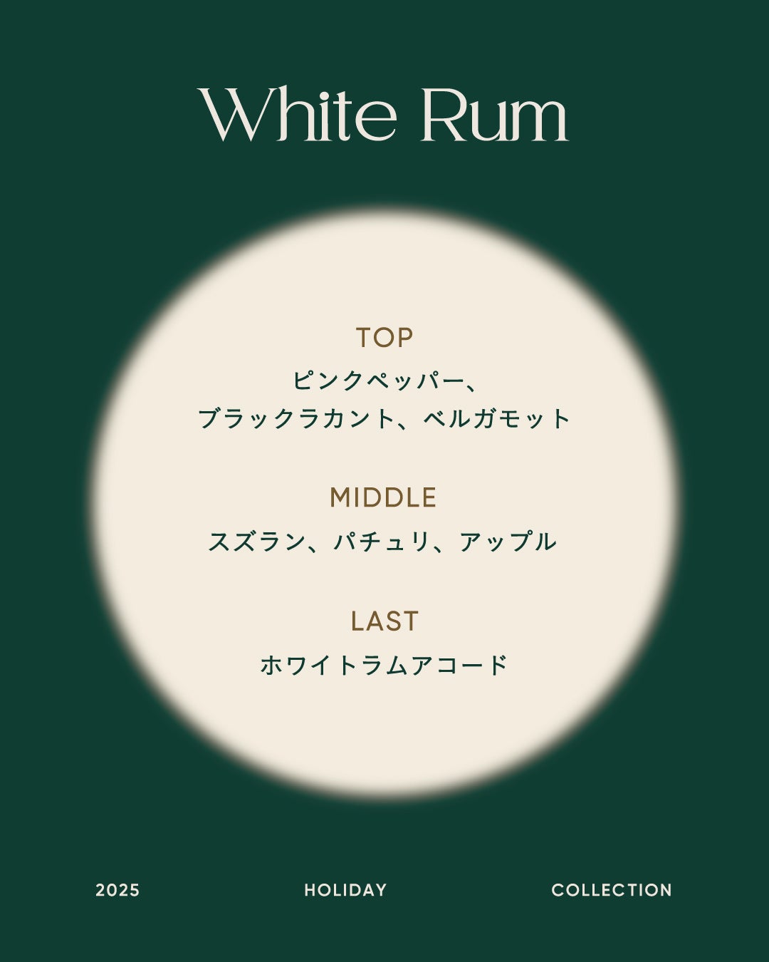 シックなアンバーとシトラスの刺激がここちよく戯れる、ホワイトラムの深く澄みわたる透明感