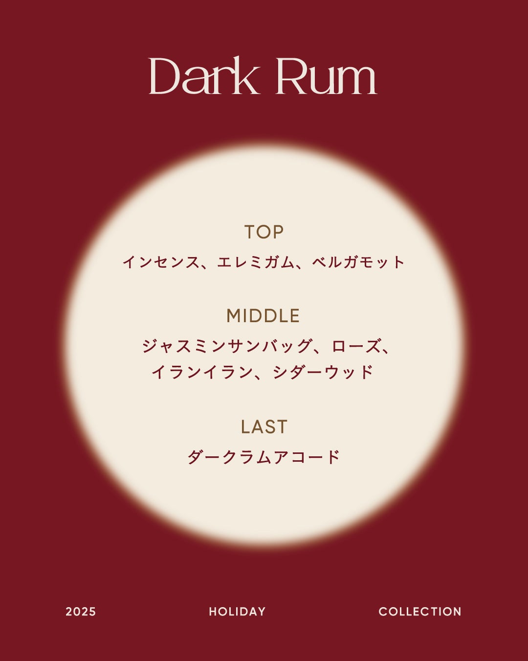 煙の立ち込めるバーカウンターで手にする、一杯のダークラム。その爽やかな口当たりを思わせるベルガモットやエレミガム、香木を感じるスモーキーなインセンスで幕を開ける香りは、自覚もないまま誰の心も陶酔させる美酒のよう。まろやかでここちよいはじまりに浸っているうちに、ローズやジャスミンサンバック、イランイランが幾重にも織りなす、このうえなく深みのあるフローラルノートへと誘われます。ラストのアコードで胸に浮かぶのは、こっくりと成熟した琥珀色のイメージ。バニラとベンゾインがじんわり広がる温もりとカラメルのようにほろ苦い甘さを紡いで、大人にふさわしい芳醇な色香を醸します。