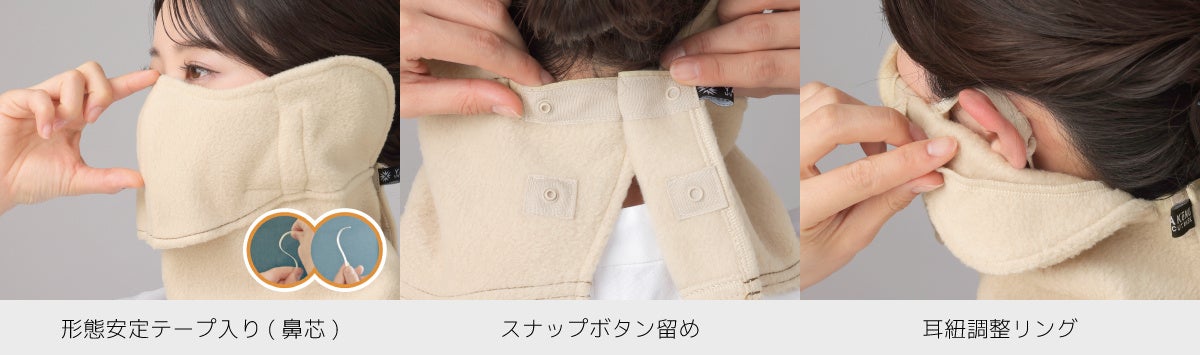 形態安定テープ入りで、口元に空間を確保し呼吸しやすく、スナップボタン留め仕様により激しい運動時でも外れにくいため、ウィンタースポーツにもぴったりです。耳紐調整リングでサイズ調整が可能なため、男女問わずお使いいただけます。