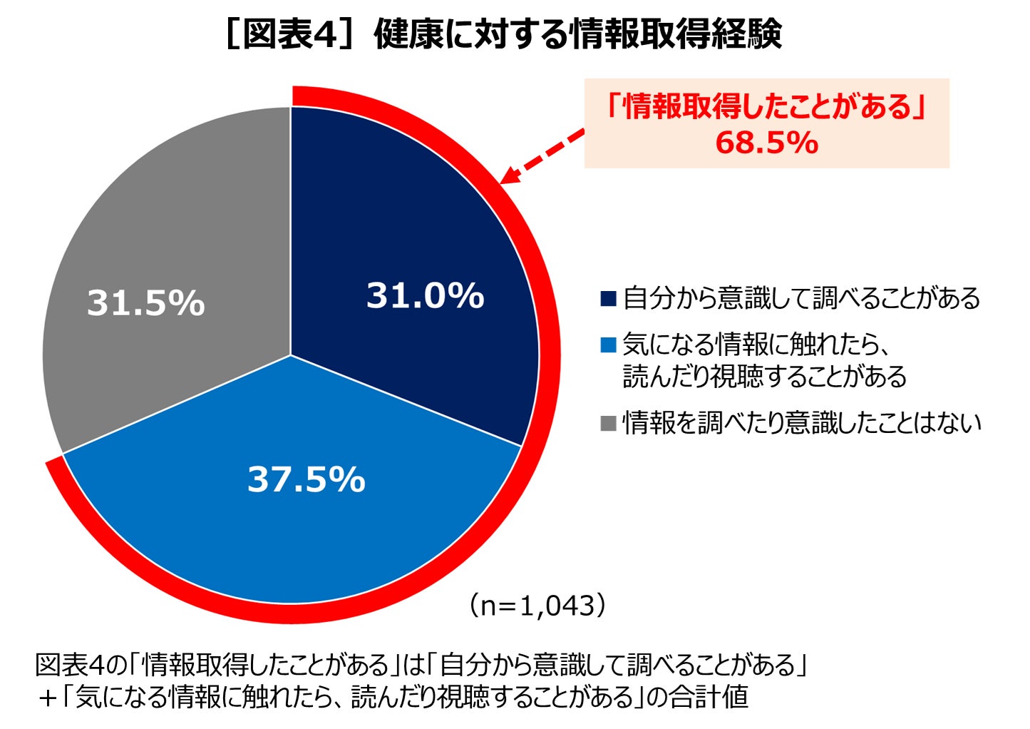 次に、からだやこころの不安や悩みについて調べた経験を尋ねたところ、約7割(68.5%)が「自分から意識して調べることがある」または「気になる情報に触れたら、読んだり視聴することがある」と回答しました[図表4]。