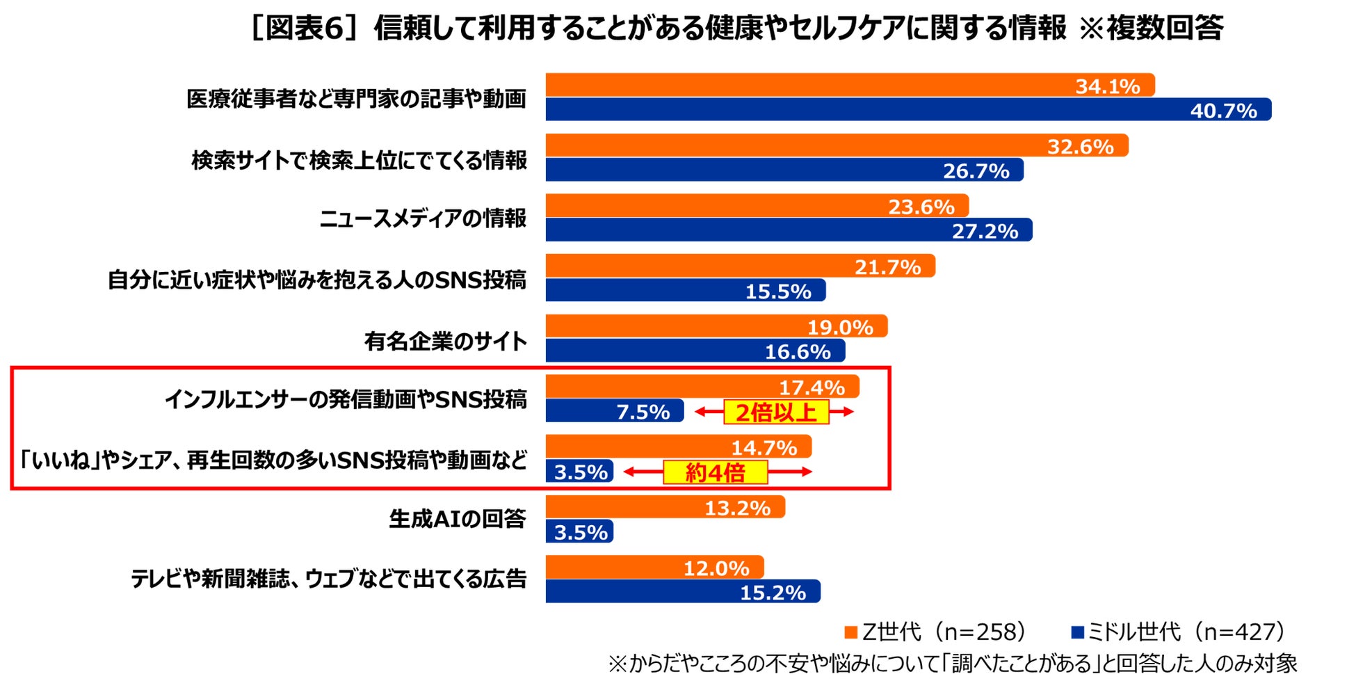 「インフルエンサー動画やSNS投稿」による健康やセルフケア情報を信頼するZ世代は17.4%で、ミドル世代7.5%の2倍以上。「バズったSNS投稿」を信頼する割合は14.7%で、ミドル世代3.5%の約4倍。