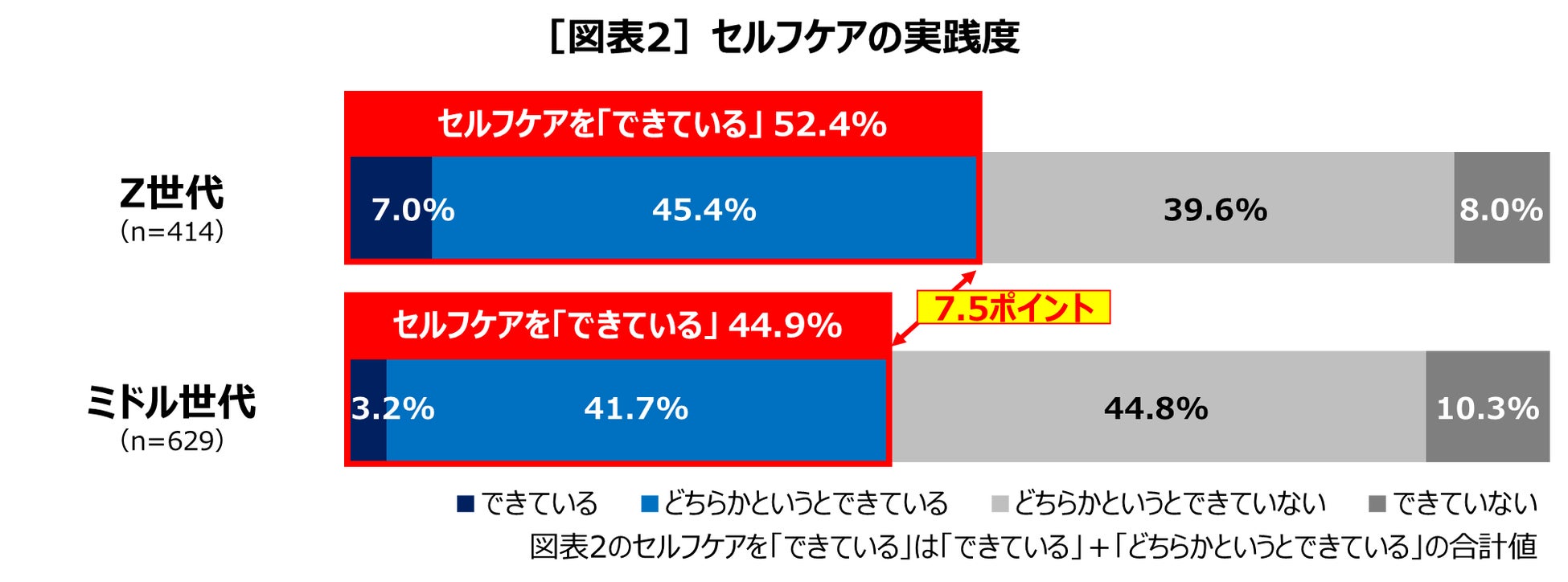 一方、セルフケアの実践度では、Z世代の半数以上(52.4%)、ミドル世代の約4割(44.9%)が「セルフケアを実践できている」と回答し、Z世代がミドル世代を7.5ポイント上回り、セルフケアへの関心がやや高い傾向があることがわかりました[図表2]