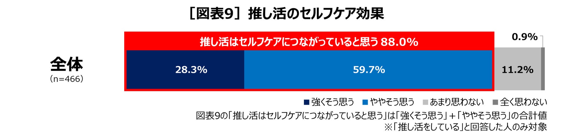 世代ごとの特徴としては、Z世代は「美容に気をつかうようになった」(23.1%)や「体力がついた」(17.0%)といった身体面への効果が目立ち、ミドル世代では「自己肯定感が高まる」(16.3%)が上位に挙がりました[図表8]。さらに「推し活はセルフケアにつながっていると思うか」と尋ねると、約9割(88.0%)が「はい」と回答。世代に関わらず、推し活をしている人の多くがセルフケア効果を実感していることがわかりました[図表9]。