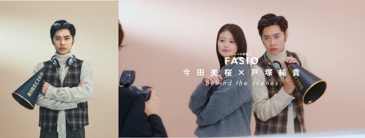 ブランドミューズの今田さんが到着したスタジオは、CMディレクター扮する戸塚さんが待つ撮影現場。「BB ティント UV カバー CMディレクター TOZUKA、今田さんに熱血指導」篇では、商品の特長である、ひと塗りで密着する、高いカバー力を表現するため、実際にCMディレクターTOZUKAが自分の肌へ塗布。監督として自ら、水を吹きかけ、耐久性を実演する様子に戸惑いを隠せない今田さん。しかし、「よ~い、FASIO」とスタートの合図がかかると一気に女優モードへ。完璧なまでに麗しい表情で魅せる今田さんに、CMディレクターTOZUKAも思わず「ブラボー…」と涙をみせるユーモラスな展開です。「うるおい整う クリーム下地 今田美桜さん & CMディレクター TOZUKA しっとりしなしな」篇では、しっとりとした使い心地を“くねくね”と全身で表現するCMディレクターTOZUKAに、今田さんの不思議そうな心の声が漏れる一面も。ぴったりと息のあったお二人のコンビネーションは必見です。