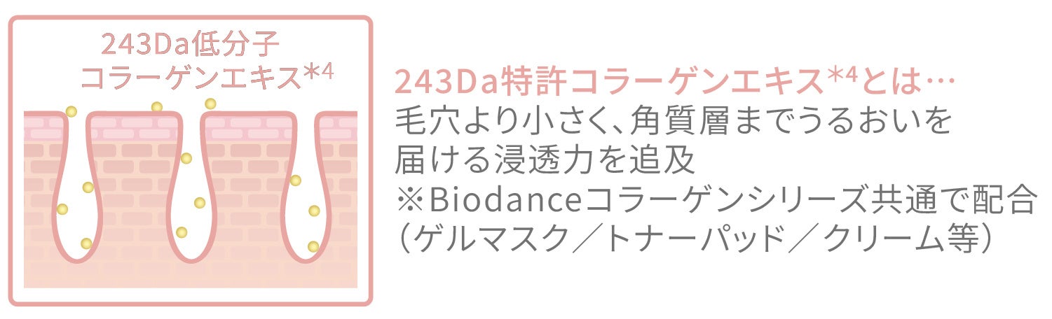 コラーゲン水*⁴と243Daコラーゲンエキス*⁴のダブルのコラーゲンを配合し、肌の弾力*³とハリ肌ケアを叶えます。