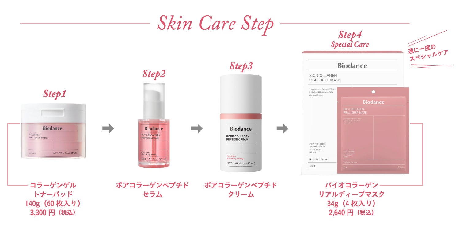 Biodanceのコラーゲンシリーズをライン使いすることでさらなる相乗効果を発揮します。見違えるほどのハリ・ツヤ感、うるおいあふれる透明美肌へと導きます。