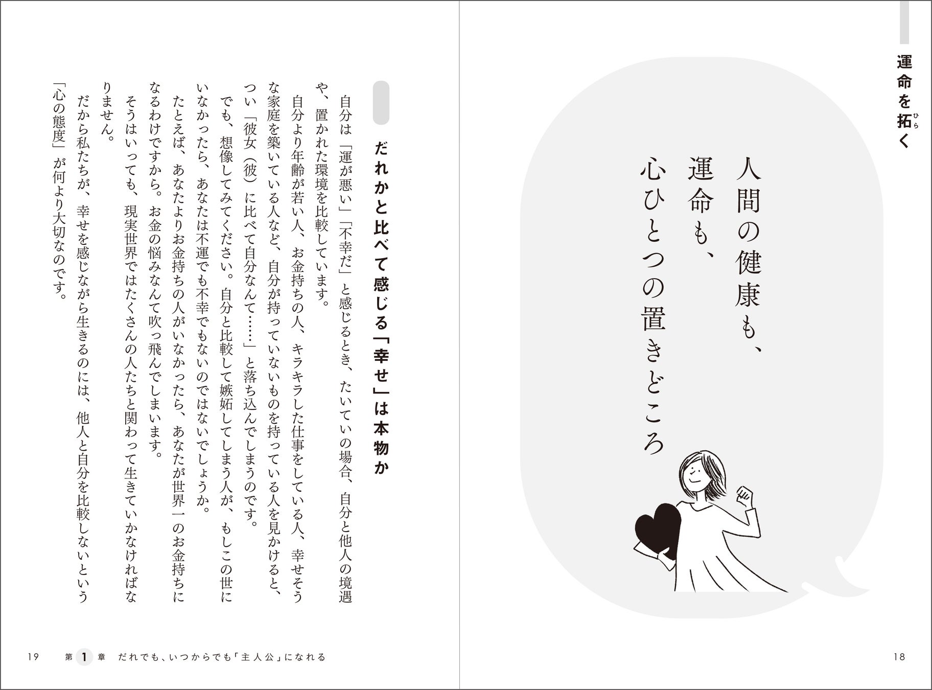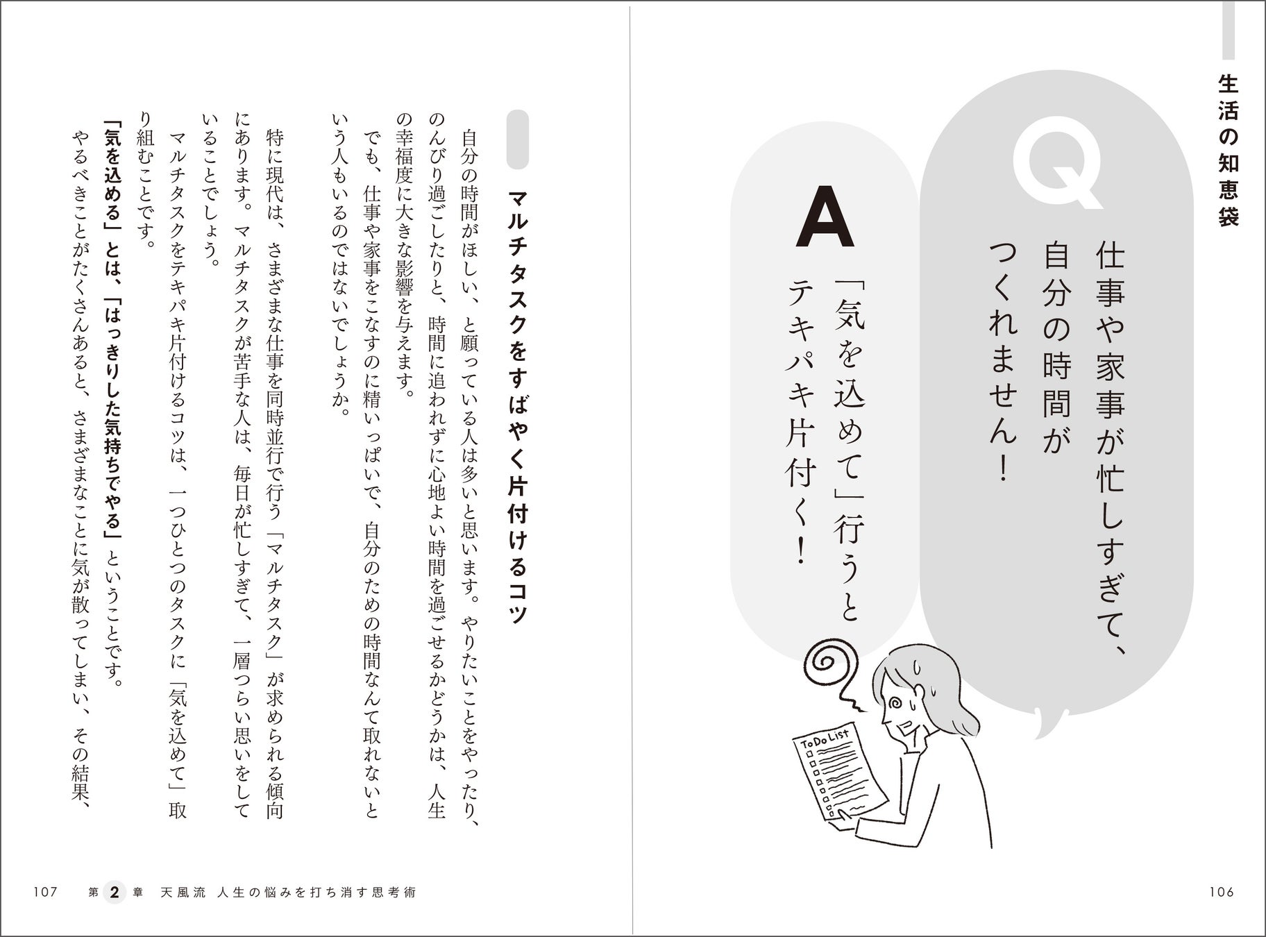 やや難解で、わかりにくい天風の言葉を、本書では女性読者にも共感しやすいテーマに置き換え、やさしい文章とイラストで解説します。忙しくて自分の時間がない、孤独を感じる、貯金がなく老後が不安――そんな悩みにも、天風流の思考術が具体的なアンサーを示してくれます。