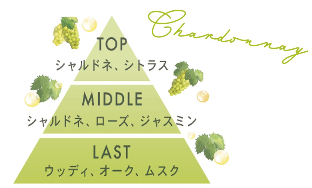 はじけるシャンパンの泡のように香り立つシャルドネと、ワイン樽のような奥深いウッディが調和した芳醇な香りです。各ノートの繊細かつ豊かで複雑な香りは、使用する人の個性やムードに深みを加え、洗練された印象を与えます。