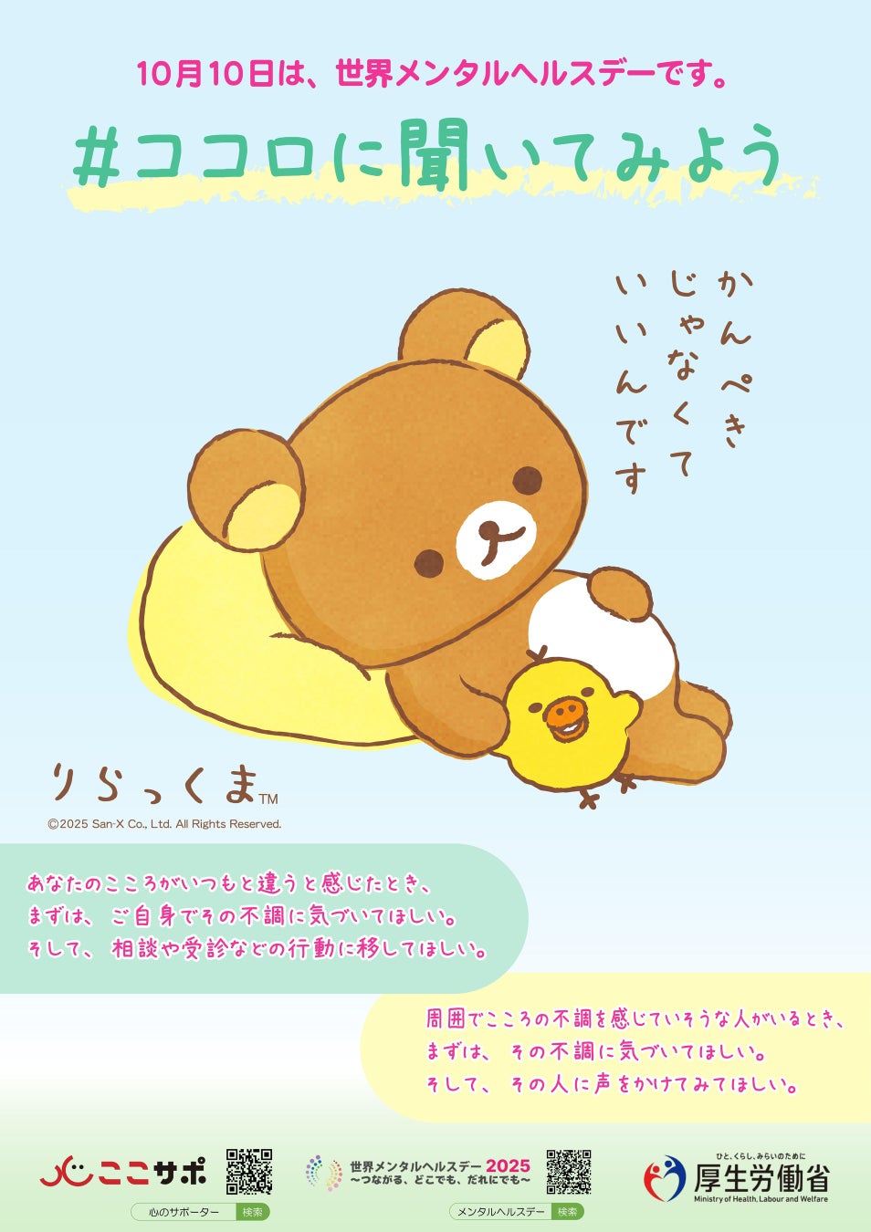サンエックス株式会社(本社:東京都千代田区、以下サンエックス)は、10月10日の「世界メンタルヘルスデー」※に伴い、厚生労働省が実施する「世界メンタルヘルスデー2025」の応援サポーターに、リラックマが2年連続で就任したことをお知らせします。