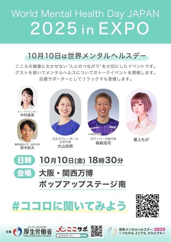 大阪・関西万博で、ゲストを招いてメンタルヘルスについてのトークイベントを開催。ゲストとして元女子バレーボール日本代表の大山加奈さん、元サッカー五輪代表の森﨑浩司さん、タレントの最上もがさんが出演します。リラックマも登場します。