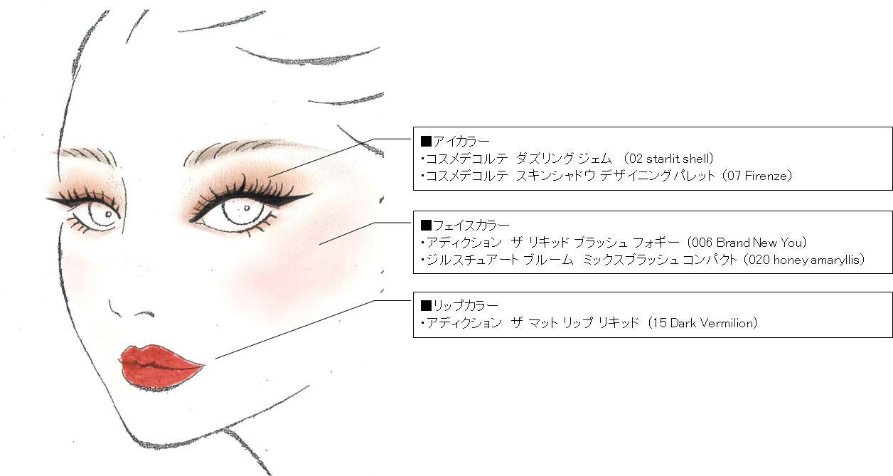 今年は“華”の要素である“血色感”に着目し、リップとチークのバランスを変えることで、彼女たちの表情をより際立たせるメイクパターンに進化させました。