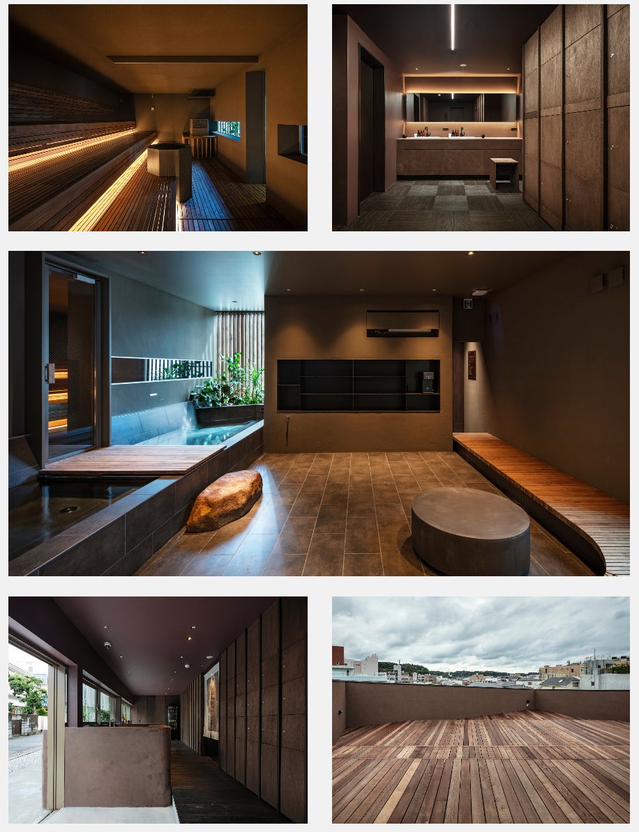 街に拓かれた大きな間口とエントランスの受付カウンターは、昭和の銭湯文化への敬意を表し、番台風のデザインで懐かしさと新しさが同居するハイブリッドデザインが特徴です。また、吉田氏は鎌倉在住ということもあり、ローカルに関係の深いメンバーが関わり合いながら、鎌倉の伝統を意識しつつクリエイティブな発想を取り入れた建築デザインを生み出しました。屋上には、開放感抜群の約48㎡の広々としたルーフトップテラスを設えました。鎌倉の空を見上げながら寝転んだり、壁にもたれたり、思い思いの心地良いひとときを過ごせる広々としたウッドデッキスペースになります。